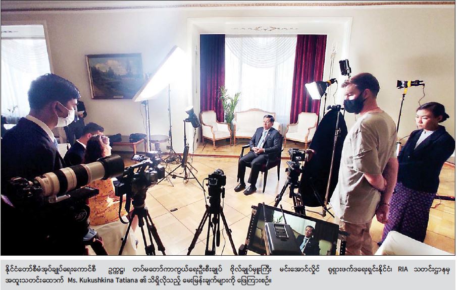 ရုရှားဖက်ဒရေးရှင်းနိုင်ငံ၌ ရောက်ရှိနေသည့် နိုင်ငံတော်စီမံအုပ်ချုပ်ရေးကောင်စီဥက္ကဋ္ဌ၊ တပ်မတော် ကာကွယ်ရေးဦးစီးချုပ် ဗိုလ်ချုပ်မှူးကြီး မင်းအောင်လှိုင် သည် ယနေ့ဒေသစံတော်ချိန် နံနက်ပိုင်းတွင် ရုရှားဖက်ဒရေးရှင်းနိုင်ငံ၊ RIA သတင်းဌာနမှ အထူးသတင်းထောက် Ms. Kukushkina Tatiana အား ခေတ္တတည်းခိုလျက်ရှိသည့် Metropol Hotel ၌ လက်ခံတွေ့ဆုံ၍ သိရှိလိုသည်များကို ဖြေကြားသည်။