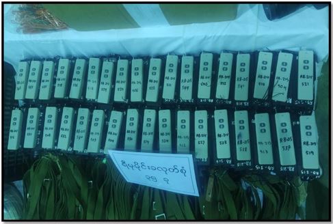 ဖမ်းဆီးရမိတရားခံများအား ဆက်လက်စစ်ဆေးမေးမြန်းချက်အရ လက်နက်/ ခဲယမ်းများအား ၆ ဘီးယာဉ် ၁ စီးဖြင့် သယ်ဆောင်လာကြောင်း သိရှိရသဖြင့် ဖမ်းဆီး ရမိရေးဆောင်ရွက်ခဲ့ရာ ညနေပိုင်းတွင် မန္တလေး-ဗန်းမော် ကားလမ်း မိုင်တိုင် အမှတ်(၂၅)၊ ဝါးရုံကုန်းကျေးရွာ၌ Nissan အမျိုးအစား ယာဉ်အမှတ်၊ 8B-9757 ၆ ဘီးယာဉ်ဖြင့် သယ်ဆောင်လာသော K 2-5 အရှည် ၃၂ လက်၊ K 2-5(ခေါက်ဒင်) ၃၂ လက်၊ M-79 LL ၄၀ လက်၊ 779 Pading III-S ၁၀ လက်၊ စုစုပေါင်း လက်နက်မျိုးစုံ ၁၁၄ လက်၊ ကျည်အိမ် ၂၄၈ ခု၊ K 2-5 ကျည် ၁၀,၀၀၀ တောင့်၊ လက်ပစ်ဗုံး ၄၉၉ လုံး၊ ၄၀ မမ ဗုံးသီး ၁,၄၇၃ လုံး၊ Remote Control မိုင်းအဝေးထိန်းခလုတ် ၃၅ ခု၊ ယမ်းမှုန့်ဟုယူဆ ရသောအထုပ် ၂၅ ထုပ်(၄.၉၆၅ ကီလိုဂရမ်)၊ လွယ်ကြိုး ၁၅၀ ချောင်း၊ လျှပ်စစ်စနက်တံ ၁ ခွေနှင့် ဒီတိုနေတာ ၃ ဖာတို့အား ဖမ်းဆီးရမိခဲ့သည်။