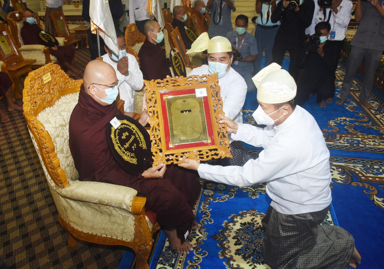 ထို့နောက် ဒီဃနိကာယ်သုံးကျမ်း သဘောရေးဖြေအောင် ဒီဃနိကာယကောဝိဒ ဘွဲ့တံ ဆိပ်တော်ရ စစ်ကိုင်းမြို့၊မင်းကွန်း တိပိဋကနိကာယကျောင်းမှ အရှင် အာနန္ဒပဏ္ဍိတာ လင်္ကာရ၊  ဝိနည်းဒုတိယပိုင်း သုံးကျမ်း သဘောရေးဖြေအောင် ဝိနယကောဝိဒ ဘွဲ့တံဆိပ်တော်ရ စစ်ကိုင်းမြို့၊ မင်းကွန်း တိပိဋကနိကာယကျောင်းမှ အရှင်မင်္ဂလာစာရ၊ ရန်ကုန် တိုင်းဒေသကြီး ဒဂုံမြို့သစ် (အရှေ့ပိုင်း)မြို့နယ်၊ တိပိဋကမဟာဂန္တဝင်နိကာယ်ကျောင်း မှ အရှင်နန္ဒိမာလင်္ကာရနှင့် အရှင် သုမင်္ဂလ၊  ဝိနည်းပထမပိုင်းနှစ်ကျမ်း သဘောရေးဖြေ အောင် ဥဘတောဝိဘင်္ဂကောဝိဒ ဘွဲ့တံဆိပ်တော်ရ စစ်ကိုင်းမြို့၊ မင်းကွန်း တိပိဋကနိ ကာယကျောင်းမှ အရှင်ဩဘာသ(ဝက်လက်)၊ အရှင်ပညာသိရီ(ဆီဆိုင်)၊ အရှင်မဏ္ဍလာလင်္ကာရ၊ ရန်ကုန်တိုင်းဒေသကြီး ဒဂုံမြို့သစ်(အရှေ့ပိုင်း)မြို့နယ်၊ တိပိဋကမဟာဂန္တဝင်နိကာယ် ကျောင်း မှ အရှင်စန္ဒိမာလင်္ကာရနှင့် အရှင်ပညာသာမီလင်္ကာရ တို့ထံ ကောင်စီဝင် ဦးမောင်းဟာ၊ ပြည်ထောင်စုဝန်ကြီးများ၊ ရန်ကုန်တိုင်းဒေသကြီးစီမံ အုပ်ချုပ်ရေးကောင်စီ ဥက္ကဋ္ဌ၊ ဒုတိယ ဗိုလ်ချုပ်ကြီး သက်ပုံ၊ ရန်ကုန်တိုင်းစစ်ဌာနချုပ် တိုင်းမှူးနှင့် တာဝန်ရှိသူများက ဘွဲ့တံဆိပ် တော်နှင့်အောင်လတ်မှတ်များဆက်ကပ်ကြသည်။
