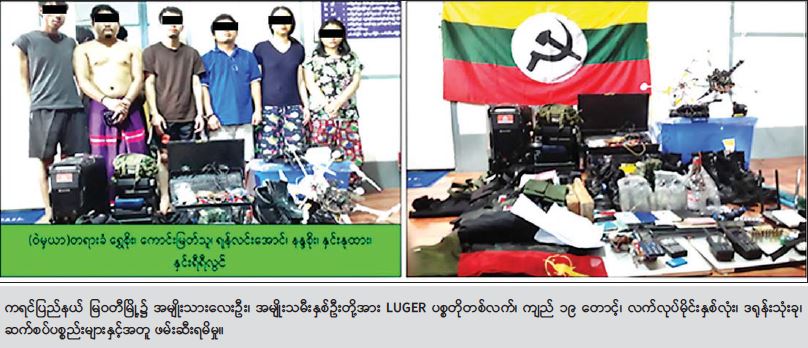 အလားတူ မွန်းလွဲ ၂ နာရီခွဲခန့်တွင် ကရင်ပြည်နယ်၊ မြဝတီမြို့၊ အမှတ်(၄)ရပ်ကွက်၊ ဇော်ဂျီ(၁)လမ်းရှိ ပိုင်ရှင်(စိစစ်ဆဲ)၏ ၅ ထပ်တိုက်အပေါ်ဆုံးထပ်၌ အကြမ်းဖက်ဖောက်ခွဲရေး ပြုလုပ်သူများ ရောက်ရှိနေထိုင်လျက်ရှိကြောင်း သတင်းအရ လုံခြုံရေးတပ်ဖွဲ့ဝင်များပါဝင်သော ပူးပေါင်း အဖွဲ့ကသွားရောက်စစ်ဆေးခဲ့ရာ အဆိုပါ အခန်းအတွင်းမှ မြဝတီမြို့နယ်၊ ထိဝါပလော ကျေးရွာနေ ကောင်းမြတ်သူ(၃၅)နှစ် (ဘ)ဦးခွေးကြီး၊ ရန်ကုန်တိုင်းဒေသကြီး၊ သင်္ဃန်းကျွန်း မြို့နယ်၊ ဇဝနရပ်ကွက်နေ ရွှေစိုး(၃၂)နှစ် (ဘ)ဦးသိန်းထွန်း၊ မန္တလေးတိုင်းဒေသကြီး၊ မိုးကုတ်မြို့၊ ကံ့ကော်ရပ်ကွက်နေ ရန်လင်းအောင် (၂၄)နှစ် (ဘ)ဦးစန်ခမ်း၊ ရှမ်းပြည်နယ် (မြောက်ပိုင်း)၊ မူဆယ်မြို့၊ ဟိုနားရပ်ကွက်နေ နန္ဒစိုး(၃၁)နှစ် (ဘ)ဦးညိုမောင်၊ ရန်ကုန် တိုင်းဒေသကြီး၊ မရမ်းကုန်းမြို့နယ်၊ (၈)မိုင်နေ မနှင်းရီရီလွင် (၂၄)နှစ် (ဘ)ဦးကျော်မြင့်နှင့် ကမာရွတ်မြို့နယ်၊ မဟာဘောဂ(၂)လမ်းနေ မနှင်းနုထား(၃၂)နှစ်တို့ ၆ ဦးအား LUGER ပစ္စတိုသေနတ် ၁ လက်၊ ၎င်းကျည် ၁၉ တောင့်၊ ဖုန်းဖြင့်တွဲလျက် လက်လုပ်မိုင်း ၂ လုံး၊ ဒရုန်း ၃ ခု၊ လက်ကိုင်ဖုန်း ၆ လုံး၊ အခြားဆက်စပ်ပစ္စည်းများတို့နှင့်အတူ တွေ့ရှိဖမ်းဆီး ရမိခဲ့ကြောင်း သိရသည်။