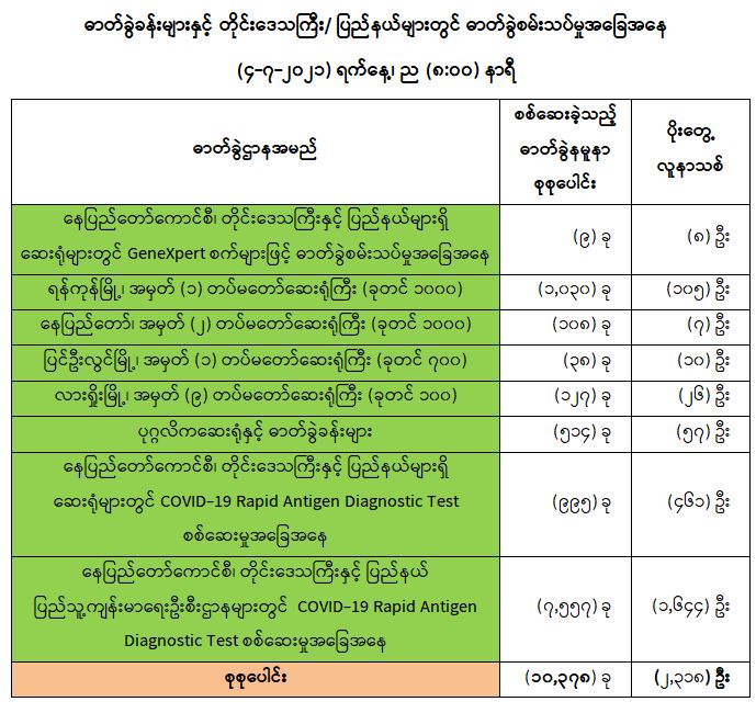 (၃-၇-၂၀၂၁) ရက်နေ့၊ ည (၈:၀၀) နာရီမှ (၄-၇-၂၀၂၁) ရက်နေ့၊ ည (၈:၀၀) နာရီအတွင်း ဓာတ်ခွဲနမူနာ စုစုပေါင်း (၁၀,၃၇၈)ခုအား စစ်ဆေးပြီးစီးခဲ့ရာ COVID-19 ရောဂါ ဓာတ်ခွဲအတည်ပြု လူနာသစ် (၂,၃၁၈) ဦး တွေ့ရှိရပါသည်။ သို့ဖြစ်ပါ၍ ယနေ့အထိ ဓာတ်ခွဲနမူနာ စုစုပေါင်း (၂,၇၇၂,၃၆၁) ခု အား စစ်ဆေးခဲ့ပြီး COVID-19 ဓာတ်ခွဲအတည်ပြုလူနာ စုစုပေါင်း (၁၆၅,၄၀၅) ဦး ရှိပြီ ဖြစ်ပါသည်။