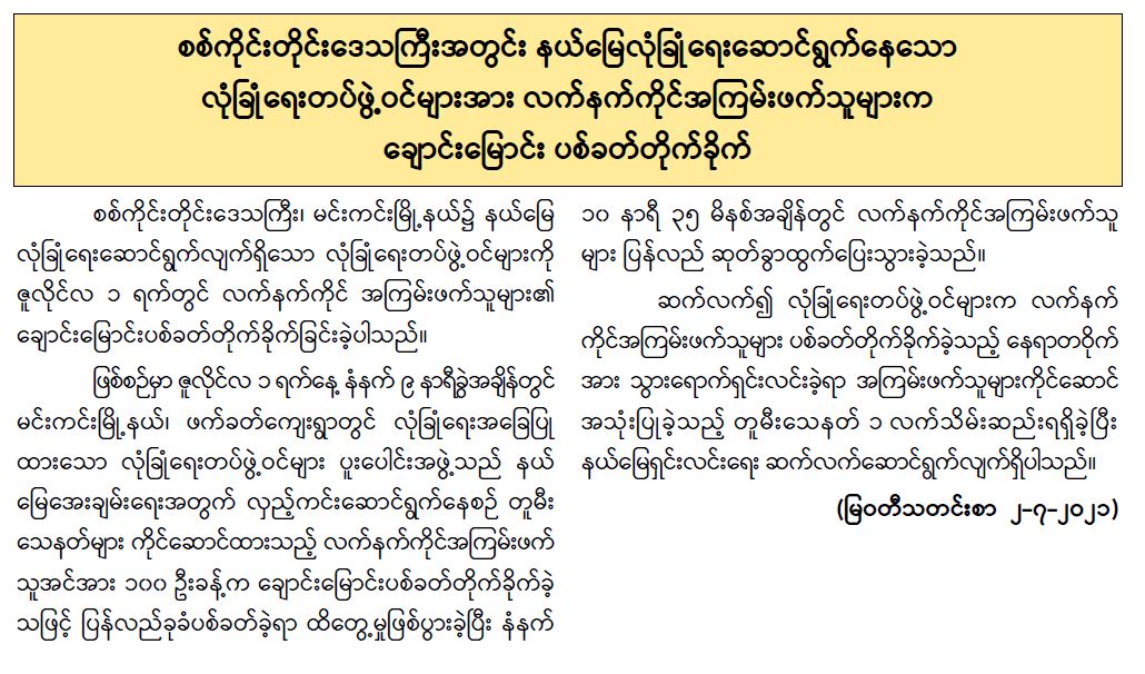 စစ်ကိုင်းတိုင်းဒေသကြီးအတွင်း နယ်မြေလုံခြုံရေးဆောင်ရွက်နေသော လုံခြုံရေးတပ်ဖွဲ့ဝင်များ အား လက်နက်ကိုင်အကြမ်းဖက်သူများက ချောင်းမြောင်း ပစ်ခတ်တိုက်ခိုက်