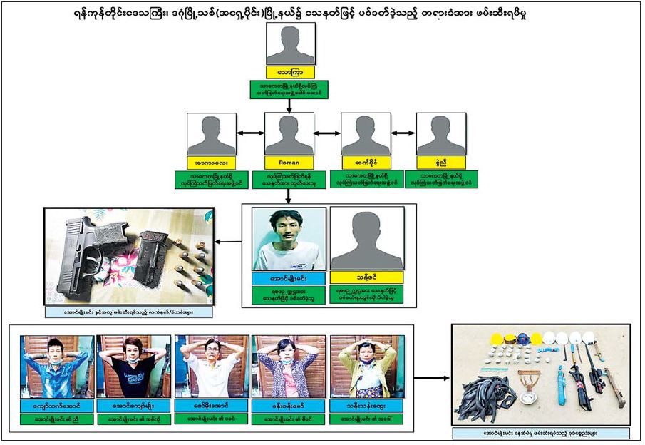 ထိုသို့ လုပ်ဆောင်လျက်ရှိမှုများကို လုံခြုံရေးတပ်ဖွဲ့ဝင်များက ဖမ်းဆီး ထိန်းသိမ်းနိုင်ရေး ဆောင်ရွက်လျက်ရှိရာ ၂၀၂၁ ခုနှစ်၊ ဇူလိုင်လ ၇ ရက်၊ နေ့လယ် ပိုင်းတွင် ဒဂုံမြို့သစ်(အရှေ့ပိုင်း)မြို့နယ်၌ အပြစ်မဲ့ပြည်သူ ၁ ဦးအား အကြမ်းဖက် အဖွဲ့ဝင် ၂ ဦးမှ ပစ္စတိုဖြင့် ပစ်ခတ်ခဲ့သဖြင့် လှည့်ကင်းဆောင်ရွက်နေသော လုံခြုံရေး အဖွဲ့မှ လုံးထွေးသတ်ပုတ်ဖမ်းဆီး ခဲ့ရာ ပြည်သူ ၁ ဦးနှင့် ရဲတပ်ဖွဲ့ဝင် ၁ ဦး ထိခိုက် ဒဏ်ရာ ရရှိခဲ့ကာ တရားခံ အောင်မျိုးမင်းအား ၉ မမ ပစ္စတို ၁ လက်၊ ၎င်းကျည် ၈ တောင့်နှင့်အတူ ဖမ်းဆီးရမိခဲ့ပြီး တရားခံ သန့်ဇင်မှာ ထွက်ပြေးလွတ်မြောက်သွားခဲ့ သည်။