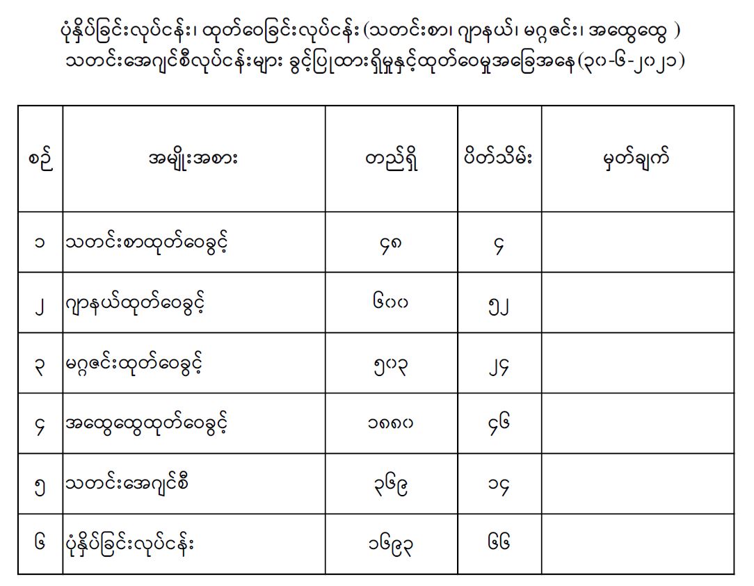 ပုံနှိပ်ခြင်းလုပ်ငန်း ထုတ်ဝေခြင်းလုပ်ငန်း (သတင်းစာ၊ ဂျာနယ်၊ မဂ္ဂဇင်း၊ အထွေထွေ) သတင်းအေဂျင်စီလုပ်ငန်းများခွင့်ပြုထားရှိမှုနှင့် ထုတ်ဝေမှုအခြေအနေ (၃၀-၆-၂၀၂၁))