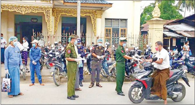 အသက်ရှူလမ်းကြောင်းဆိုင်ရာရောဂါ Coronavirus Disease 2019(COVID-19) ရောဂါ ကာကွယ်ရေး အထောက်အကူဖြစ်စေရန်အတွက် ယနေ့တွင် ဧရာဝတီတိုင်းဒေသကြီး ဟင်္သာတခရိုင် ဟင်္သာတမြို့၊ ဇလွန်မြို့၊ လေးမျက်နှာမြို့၊ မြန်အောင်မြို့နှင့် အင်္ဂပူမြို့ မအူပင်ခရိုင် ပန်းတနော်မြို့နှင့် ညောင်တုန်းမြို့၊ ဖျာပုံခရိုင် ဖျာပုံမြို့များရှိ လူစည်ကားရာ ဘုရားစေတီများ၊ ဈေးများ၊ လမ်းများ၌ ဒေသခံပြည်သူများကို အနောက်တောင်တိုင်း စစ်ဌာနချုပ်၊ တပ်နယ်အသီးသီးမှ နယ်မြေခံတပ်မတော်သားများက ဌာနဆိုင်ရာ ဝန်ထမ်းများ နှင့်အတူ ပါးစပ်၊ နှာခေါင်းစည်း ၂၄၀၀၀ ကို ဒေသခံပြည်သူများ၏ လက်ဝယ်အရောက် အခမဲ့သွားရောက်ပေးဝေ လှူဒါန်းခဲ့ကြကြောင်း သတင်းရရှိသည်။