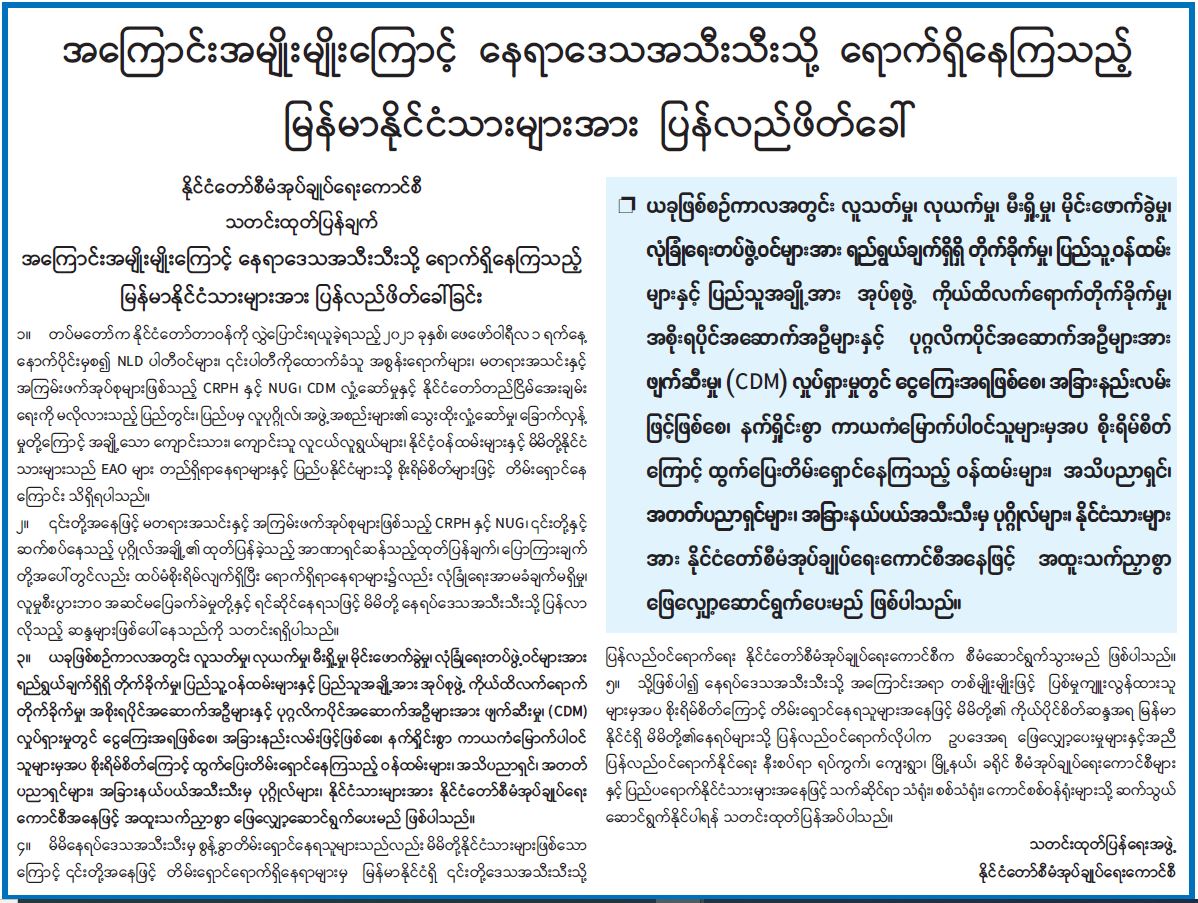 အကြောင်းအမျိုးမျိုးကြောင့် နေရာဒေသအသီးသီးသို့ ရောက်ရှိနေကြသည့် မြန်မာနိုင်ငံသားများအား ပြန်လည်ဖိတ်ခေါ် 07/12/2021