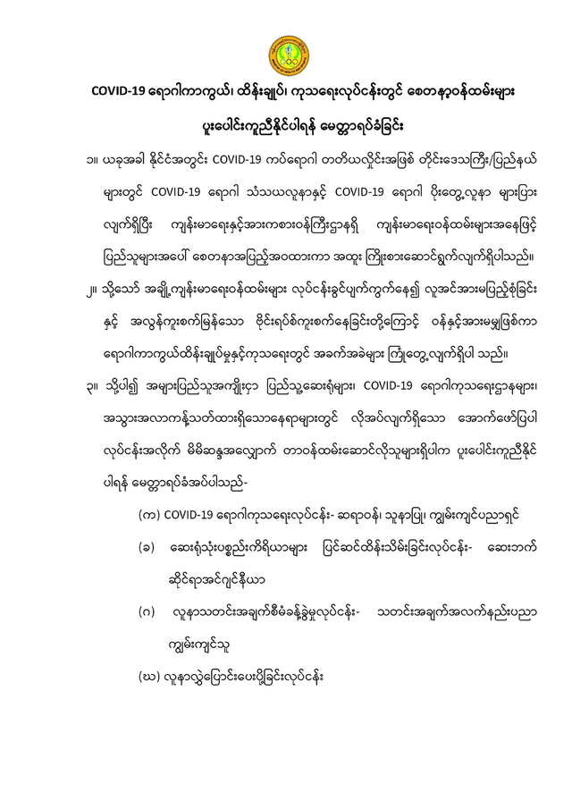 ၅။ မိမိမိသားစုနှင့် ပတ်ဝန်းကျင်မိတ်ဆွေများအား ကျန်းမာရေးစောင့်ရှောက်မှုဆောင်ရွက်ပေး နေသူများရှိပါကလည်း COVID-19 ရောဂါကုသရေးဌာနများတွင် စေတနာ့ဝန်ထမ်းအဖြစ် တာ ဝန်ထမ်းဆောင်နိုင်ရေး မိဘပြည်သူများအနေဖြင့်တိုက်တွန်းပေးပါရန် နှိုးဆော်အပ်ပါသည်။