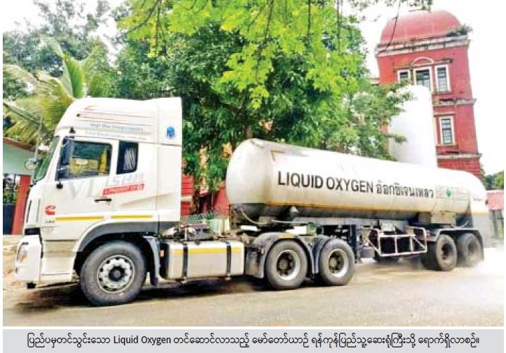 ထိုသို့ တင်သွင်းဖြန့်ဝေပေးလျက်ရှိရာ ရန်ကုန်တိုင်းဒေသကြီးအတွင်းရှိ ပြည်သူ့ဆေးရုံများနှင့် ကိုဗစ်စင်တာများအတွက် ပြည်ပမှမှာယူထားသည့် ဆေးရုံသုံး အောက်ဆီဂျင်ဓာတ်ငွေ့ရည် တင်ဆောင်လာသည့် မက်ထရစ်တန် ၂၀ ဆံ့ မော်တော် ယာဉ် ၂ စီးသည် ဇူလိုင် ၁၅ ရက် ည ၈ နာရီနှင့် ယနေ့နံနက် ၃ နာရီခန့်တို့တွင် ရန်ကုန်မြို့သို့ ရောက်ရှိခဲ့သည်။ ထိုသို့ရောက်ရှိလာသည့် Liquid Oxygen အရည်များကို ဇူလိုင် ၁၅ ရက် ညပိုင်းနှင့် ယနေ့နံနက်ပိုင်းတွင် မြောက်ဉက္ကလာပမြို့နယ်ရှိ မြောက်ဉက္က လာပဆေးရုံကြီး၊ ဝေဘာဂီ အထူးကုဆေးရုံ၊ လသာမြို့နယ်ရှိ ရန်ကုန်ပြည်သူ့ ဆေးရုံကြီး တို့ရှိ ဖိအားမြင့်အောက်ဆီဂျင် သိုလှောင်ကန်များ အတွင်းသို့ ကျွမ်းကျင်သူနည်းပညာရှင်များက ဖြည့်သွင်းပေးကြသည်။ ယင်းသို့ Liquid Oxygen များ ဖြည့်သွင်းမှုကို ရန်ကုန်တိုင်းဒေသကြီး စီမံအုပ်ချုပ်ရေး ကောင်စီဥက္ကဋ္ဌ ဦးလှစိုး နှင့် အဖွဲ့ဝင်များ၊ ရန်ကုန် တိုင်းစစ်ဌာနချုပ် တိုင်းမှူး ဗိုလ်ချုပ် ညွန့်ဝင်းဆွေ တို့က အနီးကပ်ကြည့်ရှု၍ လိုအပ် သည်များမှာကြားခဲ့သည်။