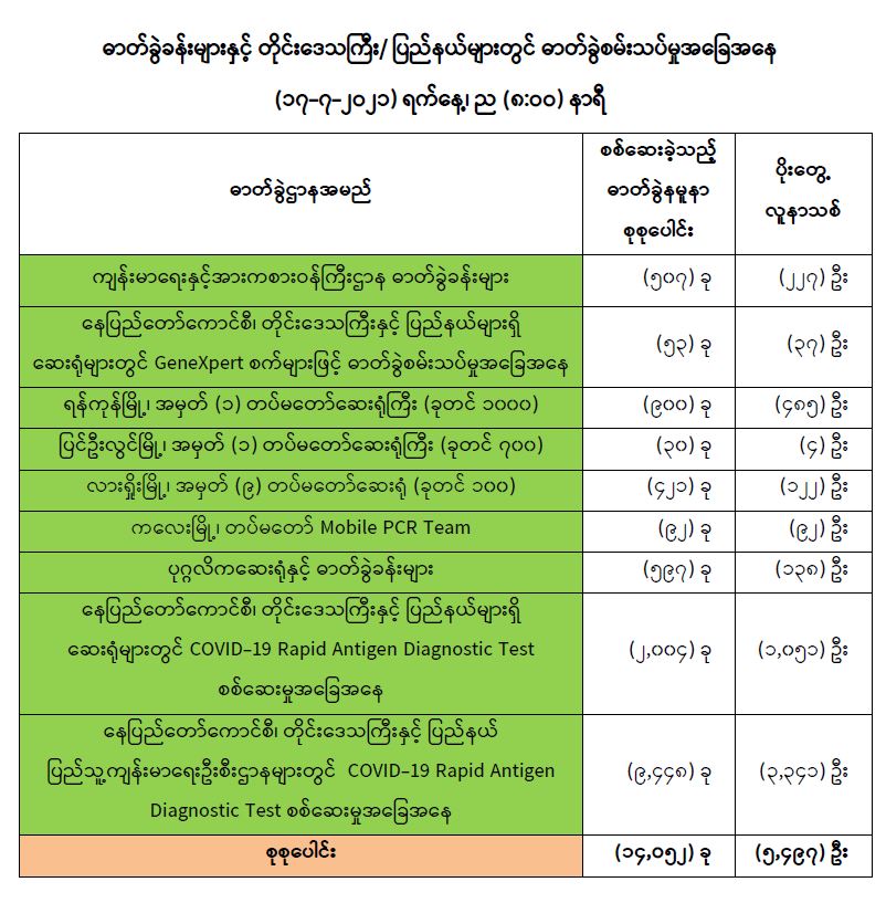 (၁၆-၇-၂၀၂၁) ရက်နေ့၊ ည (၈:၀၀) နာရီမှ (၁၇-၇-၂၀၂၁) ရက်နေ့၊ ည (၈:၀၀) နာရီအတွင်း ဓာတ်ခွဲနမူနာစုစုပေါင်း (၁၄,၀၅၂) ခုအား စစ်ဆေးပြီးစီးခဲ့ရာ COVID-19 ရောဂါ ဓာတ်ခွဲ အတည်ပြု လူနာသစ် (၅,၄၉၇) ဦးတွေ့ရှိရပါသည်။ သို့ဖြစ်ပါ၍ ယနေ့အထိ ဓာတ်ခွဲနမူနာ စုစုပေါင်း (၂,၉၅၇,၅၁၄)ခု အား စစ်ဆေးခဲ့ပြီး COVID-19 ဓာတ်ခွဲအတည်ပြုလူနာ စုစုပေါင်း (၂၂၄,၂၃၆) ဦး ရှိပြီ ဖြစ်ပါသည်။