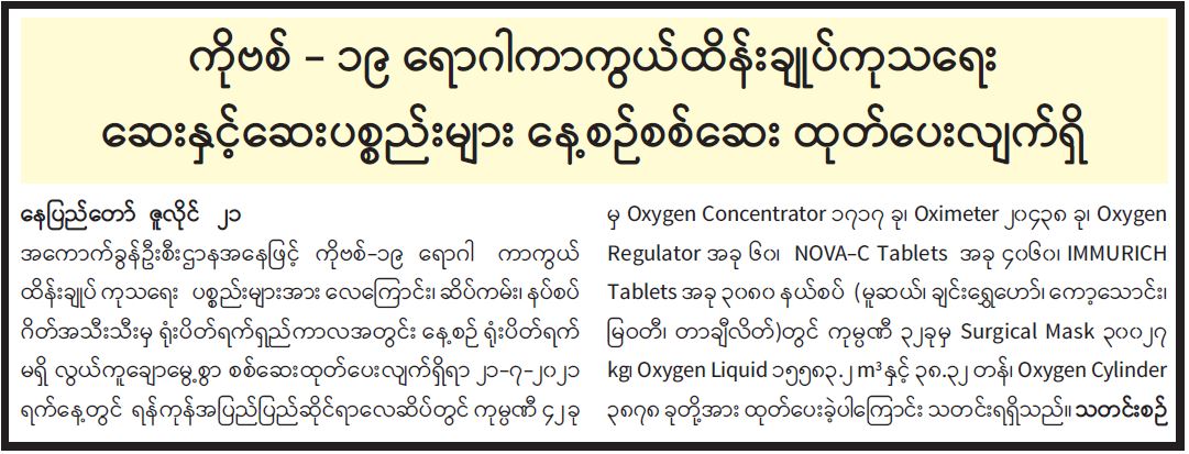 ကိုဗစ် - ၁၉ ရောဂါကာကွယ်ထိန်းချုပ်ကုသရေး ဆေးနှင့်ဆေးပစ္စည်းများ နေ့စဉ်စစ်ဆေး ထုတ်ပေးလျက်ရှိ 07/22/2021