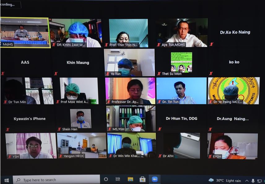 ရန်ကုန်မြို့ပေါ်တွင် ပြည်သူလူထုအခြေပြု ကိုဗစ်-၁၉ ရောဂါရှာဖွေရေး/ကုသရေးဌာနများ တိုးချဲ့ဖွင့်လှစ်နိုင်ရေး ညှိနှိုင်းအစည်းအဝေး (Zoom Meeting) ကို ယနေ့ နံနက် ၁၀ နာရီတွင် ကျန်းမာ ရေးနှင့်အားကစားဝန်ကြီးဌာန COVID-19 Command Center ၌ ကျင်းပသည်။
