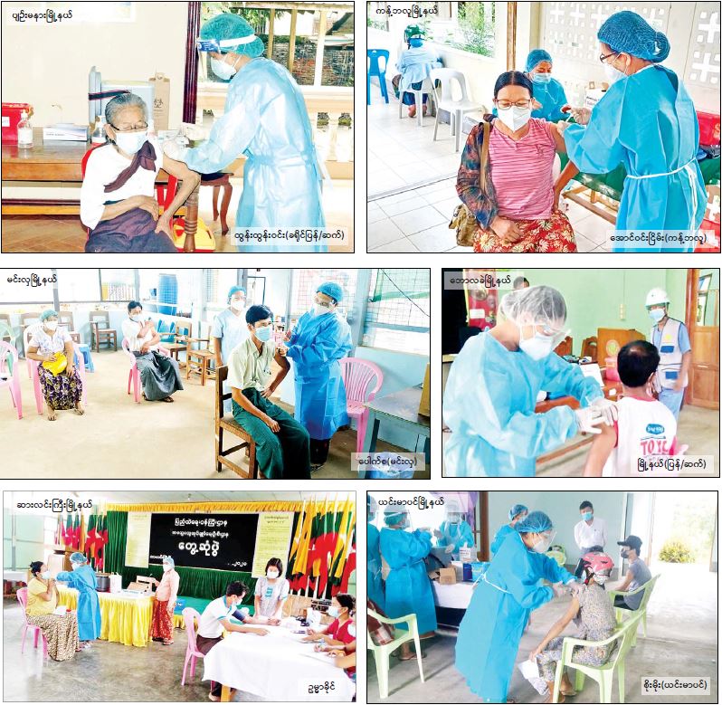 နိုင်ငံ့ဝန်ထမ်းများနှင့် ဝန်ထမ်းမိသားစုများ၊ အသက် ၆၅ နှစ်နှင့် အထက်ရှိသူများအား ဇူလိုင် ၂၈ ရက်က ကိုဗစ်-၁၉ ရောဂါ ကာကွယ်ဆေး ထိုးနှံပေးလျက်ရှိကြောင်း သိရသည်။ ကာကွယ်ဆေးထိုးခြင်းမပြုမီ လက်သန့်ဆေးရည်ဖြင့် လက်ဆေးစေခြင်း၊ ကိုယ်အပူချိန် တိုင်းတာပေးခြင်း၊ သွေးပေါင်ချိန်တိုင်းတာပေးခြင်း၊ဆေးမထိုးရအုပ်စု မှန်/မမှန် စိစစ်ပြီး ကာကွယ်ဆေး ထိုးပြီးလျှင် ဆေးနှင့် ဓာတ်မတည့်ခြင်းနှင့် ဘေးထွက် ဆိုးကျိုးလက္ခဏာများ တစ်စုံတစ်ရာ ဖြစ်ပေါ်လာပါက ချက်ချင်းအရေးပေါ် တုံ့ပြန်နိုင်ရန်အတွက် မိနစ် ၃၀ အကြာ စောင့်ကြပ်ကြည့်ရှုပေးရန် စီစဉ်ဆောင်ရွက် ပေးထားကြောင်း သိရသည်။