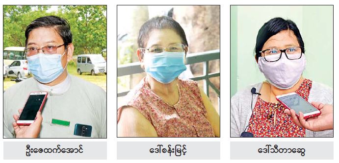 ဒီနေ့ ၆၅ နှစ်အထက် ပြည်သူတွေကို ဆေးထိုးပေးမယ်ဆိုလို့ လာရောက်ထိုးနှံ ခြင်းဖြစ်ပါတယ်။ အရင်တစ်ကြိမ် ကာကွယ်ဆေးထိုးပေးတုန်းက မထိုး လိုက်ရဘူး။ ဆေးရဲ့ ကာကွယ်နိုင်စွမ်းကို သတင်းစာတွေထဲကနေ ကြေညာထား တော့ နားလည်တယ်။ အဲဒါကြောင့် ကာကွယ်ဆေးလာထိုးတာပါ။ ကျွန်မတို့ရဲ့ ရပ်ကွက်က လူကြီးတွေနဲ့ ဌာနက လူကြီးတွေက ဆော်ဩလို့ကြားတာပါ။ ဆေးမထိုးခင်လည်း ကျန်းမာရေးနဲ့ ပတ်သက်ပြီး စစ်ဆေးမှုတွေ လုပ်ပါတယ်။ အခု ဆေးထိုးပြီးတော့ ဘာမှမဖြစ်ပါ ဘူး။ စိတ်ထဲမှာ လုံခြုံသလိုခံစားရတယ်။ နိုင်ငံတော်က ကျွန်မတို့ကို ဂရုတစိုက်နဲ့ ထိုးနှံပေးတဲ့အတွက် ကျေးဇူးလည်း တင်ပါတယ်။ ဝမ်းလည်းသာပါတယ်။ ကာကွယ်ဆေးမထိုးနှံရသေးတဲ့ ပြည်သူ တွေကိုလည်း အခွင့်အရေးရရင် လာရောက်ထိုးနှံကြပါလို့ တိုက်တွန်း ချင်ပါတယ်။