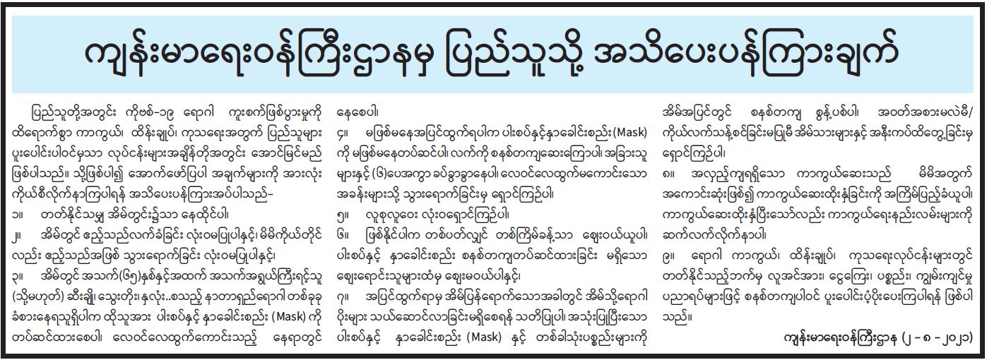 ကျန်းမာရေးဝန်ကြီးဌာနမှ ပြည်သူသို့ အသိပေးပန်ကြားချက်