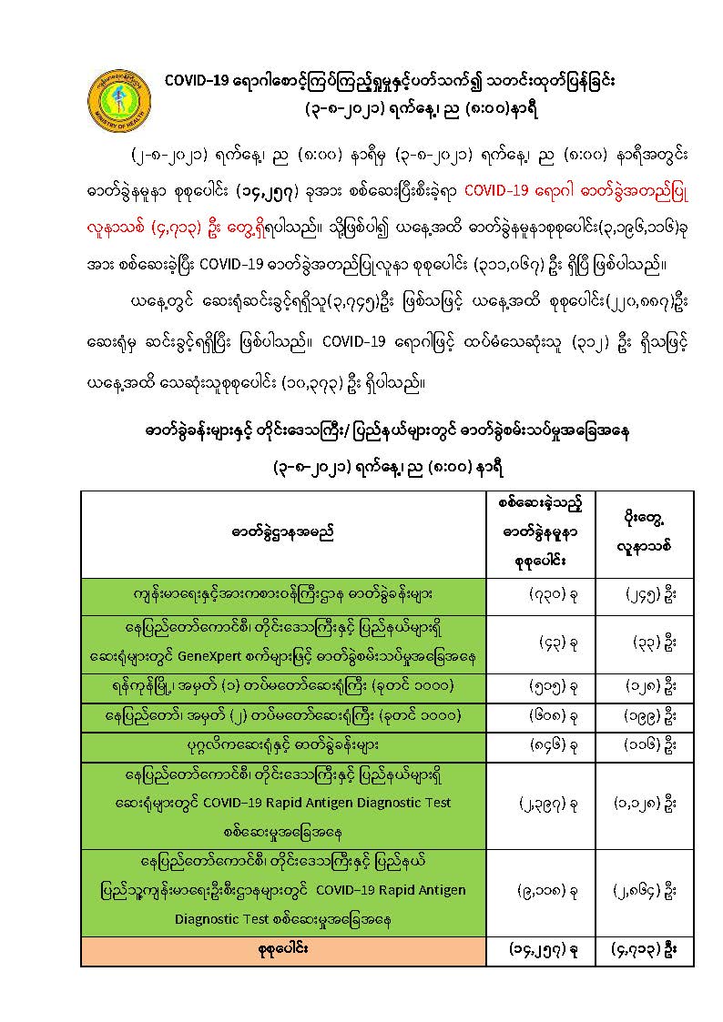 COVID-19 ရောဂါစောင့်ကြပ်ကြည့်ရှုမှုနှင့်ပတ်သက်၍ သတင်းထုတ်ပြန်ခြင်း (၃-၈-၂၀၂၁) ရက်နေ့၊ ည (၈:၀၀)နာရီ 08/03/2021