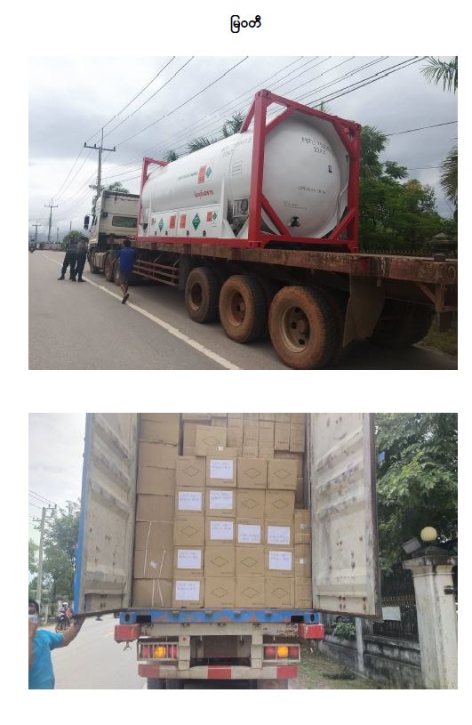 အပြည်ပြည်ဆိုင်ရာလေဆိပ်၊ ပင်လယ်ရေကြောင်းဆိပ်ကမ်းများနှင့် နယ်စပ်ကုန်သွယ်ရေး စခန်းများမှတစ်ဆင့် ပြည်သူများ အရေးပေါ်လိုအပ်လျက်ရှိသော ကိုဗစ်-၁၉ ရောဂါကာကွယ်၊ ထိန်းချုပ်၊ ကုသရေးဆိုင်ရာပစ္စည်းများအား တင်သွင်းမှုကို အများပြည်သူရုံးပိတ်ရက် များတွင်လည်း ရပ်ဆိုင်းထားခြင်းမရှိပဲ ပုံမှန်အတိုင်း လုပ်ငန်းများဆောင်ရွက်ပေးလျက်ရှိရာ ယနေ့တွင် ရန်ကုန်အပြည်ပြည်ဆိုင်ရာလေဆိပ်မှ Oxygen Concentrator (၂၅၃၂)ခု၊ Test Kit (၇၂၂၆) ခု၊ နှင့် နှာခေါင်းစည်း (Mask) (၁၁) တန် ၊ အပြည်ပြည်ဆိုင်ရာဆိပ်ကမ်းမှ Oxygen Concentrator (၁၅)ခု အပါအဝင် မူဆယ်၊ ချင်းရွှေဟော်၊ မြဝတီ၊ တာချီလိတ်၊ ထီးခီး ကုန်သွယ်ရေးစခန်းများမှ အောက်ဆီဂျင်အရည်(Bowser) ယာဉ်(၂)စီးဖြင့် (၃၅)တန်၊ အောက်ဆီဂျင်အရည်(အိုးဖြင့်) (၇)တန်၊ အောက်ဆီဂျင် (အိုးခွံ)(၆၆၉၈)ခု၊ Oxygen Plant (၁)ခု၊ Oxygen Generator (၁)ခု၊ အိမ်သုံးအောက်ဆီဂျင်စက် (Oxygen Concentrator)(၂၈၈၈)ခု၊ Test Kit (၇၂၂၆) ခု၊ PPE ဝတ်စုံ (၁၅၉၆၀) ၊ လက်အိတ်(၈)တန်နှင့် နှာခေါင်းစည်း (Mask) (၄၉) တန်တင်သွင်းနိုင်ခဲ့သည်။ အထက်ပါပစ္စည်းများအား ကုမ္ပဏီ(၂၄)ခုမှ ယာဉ်စီးရေ (၄၃)စီးဖြင့် တင်သွင်းလာခြင်း ဖြစ်သည်။