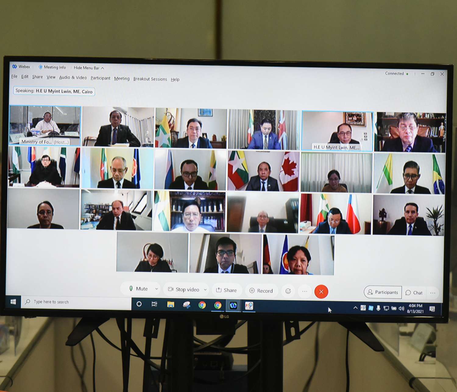 နိုင်ငံခြားရေး ဝန်ကြီးဌာန ပြည်ထောင်စုဝန်ကြီး ဦးဝဏ္ဏမောင်လွင်နှင့် အပြည်ပြည်ဆိုင်ရာ ပူးပေါင်းဆောင်ရွက်ရေး ဝန်ကြီးဌာန ပြည်ထောင်စုဝန်ကြီးဦးကို ကိုလှိုင်တို့ဦးဆောင်၍ အရှေ့ အလယ်ပိုင်းနှင့် အာဖရိကဇုန်၊ ဥရောပဇုန်၊ အမေရိကဇုန်နိုင်ငံများရှိ မြန်မာသံရုံးနှင့် အဖွဲ့ရုံးများမှ မြန်မာ သံအမတ်ကြီးများ၊ အမြဲတမ်း ကိုယ်စားလှယ်များနှင့် သံရုံးအကြီးအကဲများကို လက်ရှိဖြစ်ပေါ် တိုးတက်လျက်ရှိသော နိုင်ငံရေး အခြေအနေများနှင့် ဆောင်ရွက်ချက်များအား အသိပေးရှင်းလင်းခြင်း ညှိနှိုင်း အစည်းအဝေးကို ယနေ့ ညနေ ၄ နာရီတွင် ဗီဒီယိုကွန်ဖရင့်စနစ် ဖြင့် နိုင်ငံခြားရေးဝန်ကြီးဌာန ဧရာဝတီခန်းမ၌ ကျင်းပသည်။