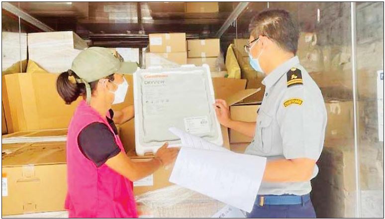 အကောက်ခွန်ဦးစီးဌာန အနေဖြင့် ကိုဗစ်-၁၉ ရောဂါ ကာကွယ်ထိန်းချုပ်ကုသရေးပစ္စည်းများအား လေကြောင်း၊ ဆိပ်ကမ်း၊ နယ်စပ်ဂိတ် အသီးသီးမှ ရုံးပိတ်ရက်ရှည်ကာလအတွင်း နေ့စဉ်ရုံးပိတ်ရက် မရှိလွယ်ကူချောမွေ့စွာ စစ်ဆေးထုတ်ပေးလျက်ရှိရာ ၁၈-၈-၂၀၂၁ ရက်နေ့၌ ရန်ကုန်အပြည်ပြည် ဆိုင်ရာလေဆိပ်တွင် ကုမ္ပဏီ (၄၁) ခုမှ ENOXAPARIN INJECTION (၁၂၀၀၀)ခု၊ CRYOGENIC GAS YUNDER (၆)ခု၊ FLOW METER (၁၂၅၀)ခု၊ HAND HELD UVC DCSIN ECTION LAMP (၄)ခု၊ N95 MASK (၁၂၁၀၀)kg ၊ NANSAL CANNULA (၁၀၁၀)ခု၊ OXIMETER (၆၀၀၀)ခု၊ OXYGEN CONCENTRATOR (၁၃၃၂)ခု၊ OXYGEN MASK (၂၁၀၀)kg ၊ OXYGEN CONCENTRATOR SPARE PARTS (၁၇၉)ခု၊ SPIROMETER (၂၀၀၀)ခု၊ THERMOMETER (၂၀၀)ခု၊ UVC DIGITAL SANITIZER (၂)ခု၊ ရန်ကုန်ဆိပ်ကမ်းများမှ OXYGEN CYLINDER (၃၃၆၀)ခု၊ OXYGEN INHALATOR (၂၁၀၀)ခု၊ NASAL CANNULA (၄၇၀၀)ခု၊ CYLINDER VALVE (၁၃)ခု၊ OXYGEN PLANT (၆)ခု၊ OXYGEN CONCENTRATOR (၁၅၀)ခု၊ FLOW METER (၁၅၀)ခု၊ MASK (၄၄၀၀)ခု၊ ကိုဗစ်-၁၉ ကာကွယ်ကုသဆေးနှင့် အခြားဆေးမျိုးစုံ (၂၃၂၄၃.၈၄၇)kg၊ နယ်စပ် (ကန်ပိုက်တီး၊ ချင်းရွှေဟော်၊ မူဆယ်၊ တာချီလိတ်၊ ကော့သောင်း၊ မြဝတီ)တွင် ကုမ္ပဏီ (၂၅) ခုမှ OXYGEN CYLINDER (၅၄၀၉) ခု၊ OXYGEN CONCENTRATOR (၉၁၆)ခု၊ MASK (၁၈၆၂၁)kg ၊ LIQUID OXYGEN (၁၅၀၄၈)m3၊ FLOW METER (၂၂၀၀)ခု၊ PPE (၂၀၂၅)ခု၊ OXYGEN PLANT (၂)ခု၊ NASAL CANNULA (၄၀၀)ခု၊ SODIUM CHLORIDE INJECTION (၆၄၀၀၀)ခု၊ DISPOSABLE CAP (၇၂၃၆) kg၊ OXYGEN REGULATOR (၃၀၁၅)ခု ၊ TROLLEY (၈၄၀)ခု တို့အားထုတ်ပေးခဲ့ကြောင်း သတင်းရရှိပါသည်။