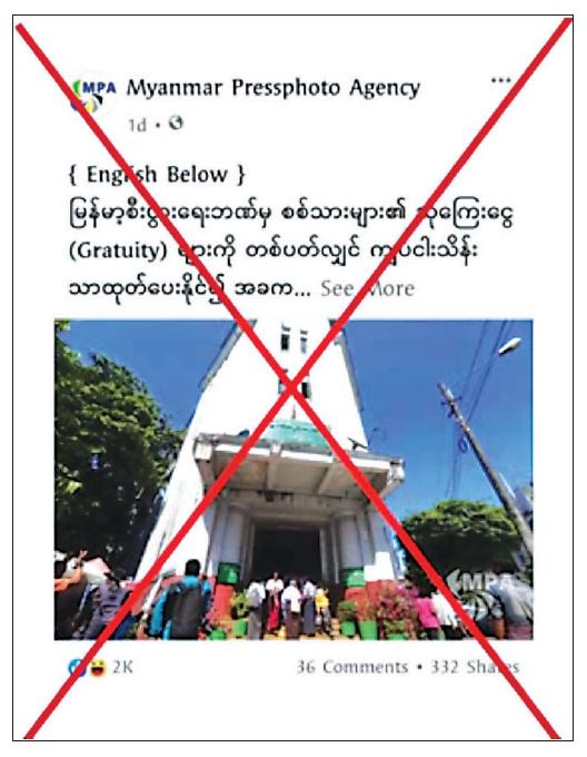 လတ်တလော လူမှုကွန်ရက်စာမျက်နှာများတွင် မြန်မာ့စီးပွားရေးဘဏ်က တပ်မတော် သားများ၏ ဆုကြေးငွေများကို တစ်ပတ်လျှင် ကျပ်ငါးသိန်းသာ ထုတ်ပေးနေကြောင်း မဟုတ်မမှန်ရေးသား ဖော်ပြထားသည်ကို တွေ့ရှိရပါသည်။ အဆိုပါသတင်းနှင့်ပတ်သက်၍ မြန်မာ့စီးပွားရေးဘဏ်(ရုံးချုပ်) ချေးငွေ စိစစ်ကြီးကြပ်ကွပ်ကဲရေးဌာနခွဲ ဒုတိယအထွေထွေ မန်နေဂျာ ဒေါ်ဥမ္မာသန်းက ကာကွယ်ရေးဝန်ကြီးဌာနမှ အငြိမ်းစားအရာရှိသာမက အခြားအဆင့် ဝန်ထမ်းများ၏ အငြိမ်းစားဆုကြေးငွေကို ဇူလိုင်လ ၆ ရက်နေ့ကတည်းက အပြည့်အဝတစ်လုံးတစ်ခဲတည်း ထုတ်ပေးလျက်ရှိသလို ယခင်ခွင့်ပြုမိန့်ကျပြီးသည့် အငြိမ်းစား ဆုကြေးငွေတွေကိုလည်း ယခုအချိန်တွင် တစ်လုံးတစ်ခဲတည်း အပြည့်အဝ ထုတ်ပေးလျက် ရှိကြောင်း ယခုကဲ့သို့ ရှင်းလင်းဖြေကြားထားပါသည် -