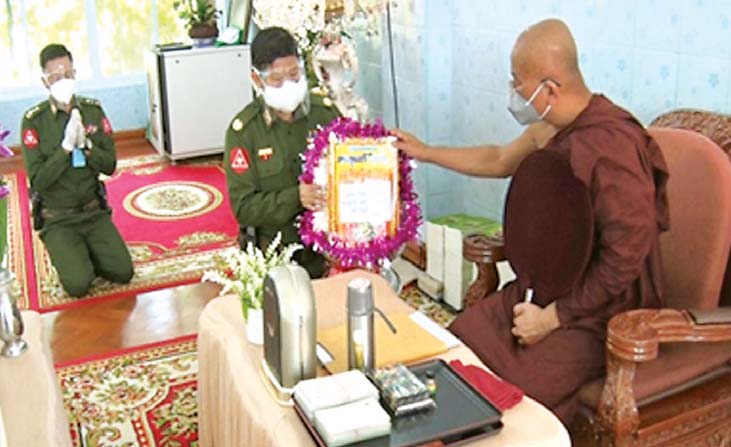 ထိုသို့ဆောင်ရွက်လျက်ရှိရာ ယနေ့တွင် ရှမ်းပြည်နယ်(အရှေ့ပိုင်း)၊ တာချီလိတ်မြို့၊ ပုန်းထွန် ရပ်ကွက်ရှိ ငွေတောင်ဦးကမ္မဌာန်း ကျောင်းတိုက်၊ ရန်ကုန်တိုင်းဒေသကြီး၊ မင်္ဂလာဒုံမြို့နယ်၊ ပေါက်ကုန်းရပ်ကွက်ရှိ မဟာရွှေမင်္ဂလာ ကျောင်းတိုက်၊ ဒလမြို့နယ်၊ ဓနုတ်စံပြ ကျေးရွာရှိ ဓနုတ် ကျောင်းတိုက်နှင့် မန္တလေးတိုင်းဒေသကြီး၊ ချမ်းမြသာစည် မြို့နယ်၊ မဟာဓမ္မိကာရာမတိုက်၊ နံ့သာမြိုင်ဗိုလ်ကျောင်းတို့ရှိ ဆရာတော်၊ သံဃာတော်များနှင့် သာသနာနွယ်ဝင် သီလရှင်များ အား ဆွမ်းဆန် တော်၊ ဆီ၊ ဆား၊ ပဲ အမယ်(၄)မျိုး၊ နေ့ဆွမ်းများ၊ ကိုဗစ်-၁၉ ရောဂါ ကာကွယ်ရေး အထောက်အကူပြုပစ္စည်းများ၊ နဝကမ္မ အလှူငွေများနှင့် လှူဖွယ်ပစ္စည်းများကို သက်ဆိုင်ရာ တိုင်းစစ်ဌာနချုပ်များမှ တိုင်းမှူးများနှင့် တာဝန်ရှိသူများက သွားရောက် ဆက်ကပ် လှူဒါန်းကြသည်။