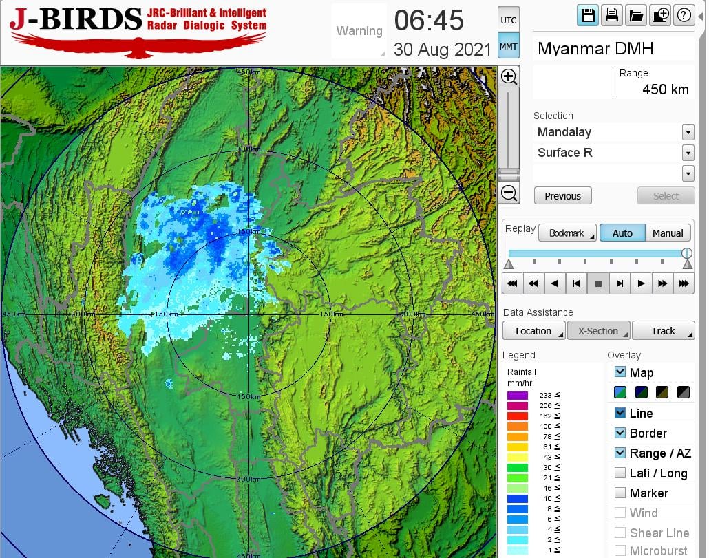 မန္တလေးမြို့နှင့် အနီးတစ်ဝိုက်အတွက် ယနေ့ညနေအထိ ခန့်မှန်းချက်။ မိုးတစ်ကြိမ်၊ နှစ်ကြိမ် ထစ်ချုန်းရွာမည်။ရွာရန်ရာနှုန်းပြည့် ဖြစ်ပါသည်။
