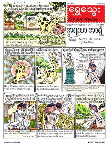 စက်တင်ဘာလ ၄ ရက် (စနေနေ့)တွင် ထုတ်ဝေမည့် ရွှေသွေးဂျာနယ်တွင် အရသာချိုမြိန်သည့် မြက်များကို စွဲလမ်းနှစ်သက်မိသည့်အတွက် အရသာ၏ နောက်သို့လိုက်ရင်း ဥယျာဉ်မှူး၏ လှည့်ကွက် အတွင်းသို့ရောက်ရှိပြီး ဘုရင့်ထံ ဆက်သခံရသည့် ရွှေသမင်လေး အကြောင်း တင်ဆက်ထားသည့် “အရသာ အာရုံ” မျက်နှာဖုံး ဇာတ်လမ်း၊ လူတို့ ခန္ဓာကိုယ်ရှိ အာရုံခံစားမှုများအကြောင်းကို ဗဟုသုတဖြစ်ဖွယ် တင်ဆက်ထားသည့် “အာရုံခံစားမှုများ” သုတဆောင်းပါး၊ သူတစ်ပါး၏ လုပ်အားအပေါ် အမြတ်ထုတ်လိုသူတို့၏ အခက်တွေ့ရပုံကို သင်ခန်းစာယူဖွယ် တင်ဆက်ထားသည့် “ကိုယ့်အတက် ကိုယ်စူး” နှစ်မျက်နှာ ကာတွန်း၊ ကိုဗစ်ကာလအတွင်း ကလေးများ ကိုယ်လက်လှုပ်ရှားအားကစားလုပ်ရန်၊ ကျန်းမာရေးနှင့် ညီညွတ်အောင် စားသောက်နေထိုင်ကြရန်နှင့် လက်လှမ်းမီ အပျင်းပြေ ဖျော်ဖြေရေးနည်း လမ်းများတွင် လိုက်ပါဆောင်ရွက်ကြသင့်ပုံကို တင်ဆက်ထားသည့် “ကလိုက်ကြစို့ တူပျော်ပျော်" ကလေးဝတ္ထု၊ မိမိပိုင်ဆိုင်ထားသည့် အလှအပသည် သဘာဝကပေးသည့် ဆုလာဘ် တစ်ခုဖြစ်ပုံ၊ မိမိနှင့်သူတစ်ပါးကို အမြဲနှိုင်းယှဉ်ပြီး အားငယ်စိတ် မဝင်သင့်ပုံကို သင်ခန်းစာပေးတင်ဆက်ထားသည့် ကျီးကန်းလေးမဲမဲပါဝင်သည့် “အပျော်ဆုံးက ဘယ်သူဖြစ် မလဲ” ပုံပြင်၊ သူငယ်ချင်း ဖြစ်သူအပေါ် သံသယထားနေရာမှ သူငယ်ချင်း၏ စိတ်ထားကောင်း၍ လူကြီးသူမအပေါ် ကူညီတတ်ပုံကြောင့် အချင်းချင်း ပြန်လည်ချစ်ခင် သွားကြပုံကို တင်ဆက် ထားသည့် “ပေါက်ကျော်ပါဝင်သော ချစ်ချစ်ခင်ခင်” နှစ်မျက်နှာ ကာတွန်းအပါအဝင် ရွှေသွေး အင်္ဂလိပ်စာကဏ္ဍ၊ ပုံဆွဲနည်း အခြေခံနည်းလမ်းကဏ္ဍ၊ ကဗျာကဏ္ဍ စုံလင်စွာဖြင့် ဖတ်စရာ မှတ်စရာများ ပါရှိကြောင်း သိရှိရသည်။