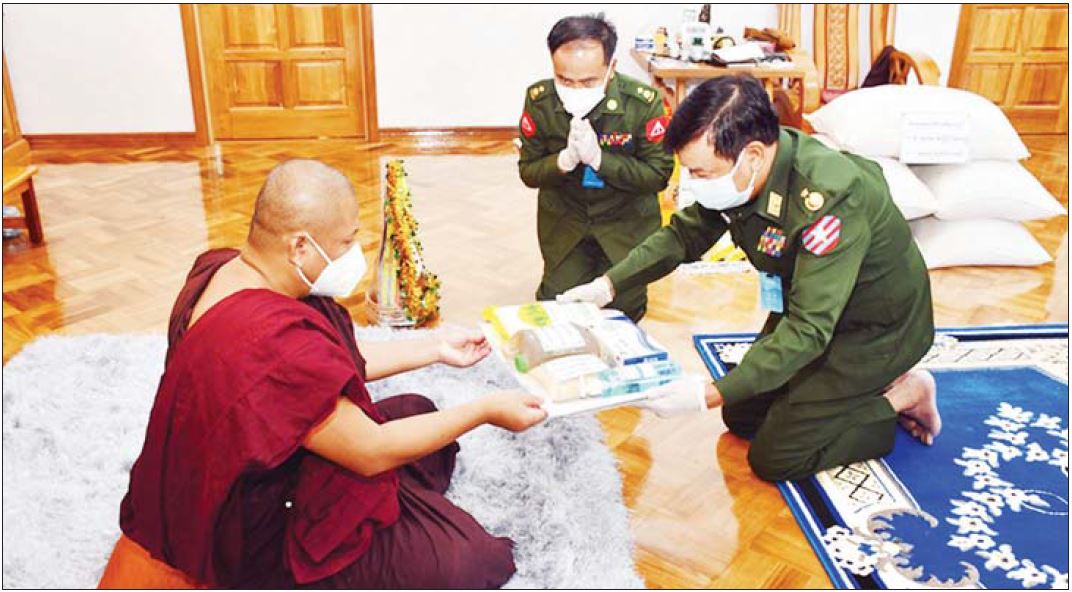 တပ်မတော်(ကြည်း၊ရေ၊လေ) အရာရှိ၊ စစ်သည်၊ အရာထမ်း၊ အမှုထမ်းများနှင့် စေတနာရှင် အလှူရှင်များက ကိုဗစ်-၁၉ ရောဂါ ကြိုတင်ကာကွယ်ရေးလုပ်ငန်းများ ဆောင်ရွက်နေသည့် ကာလအတွင်း ဆွမ်းကိစ္စရပ်များ အဆင်ပြေစေရန် ရည်ရွယ်၍ မြို့နယ်အသီးသီးရှိ ဘုန်းတော်ကြီးကျောင်းများ၊ သာသနာ့နွယ်ဝင် သီလရှင်ကျောင်းများနှင့် ဘာသာရေးကျောင်းများတွင် ဆွမ်းဆန်တော်၊ ဆီ၊ ဆား၊ ပဲ အမယ်(၄)မျိုးနှင့် လှူဖွယ်ပစ္စည်းများလှူဒါန်းခြင်း၊ နေ့ဆွမ်းများ ဆက်ကပ်လှူဒါန်းခြင်းနှင့် ကျန်းမာရေး စစ်ဆေးပေးခြင်းများကို ဆောင်ရွက်လျက်ရှိသည်။