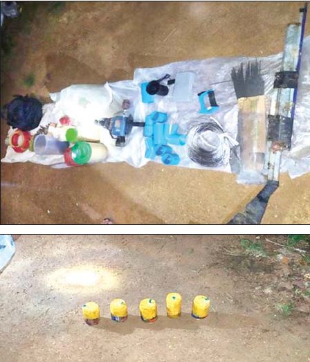 ပေါက်ကွဲသည့်ဝန်းကျင်တွင် လက်လုပ်မိုင်း ငါးလုံး၊ ဒီတိုနေတာ အခု ၃၀ ၊ ယမ်းကြိုး(အမြန်) ၂၇ မီတာနှင့် ဖောက်ခွဲရာတွင် အသုံးပြုသည့် ဆက်စပ်ပစ္စည်းများနှင့်အတူ ဖမ်းဆီးရမိခဲ့ကြောင်း သိရ သည်။