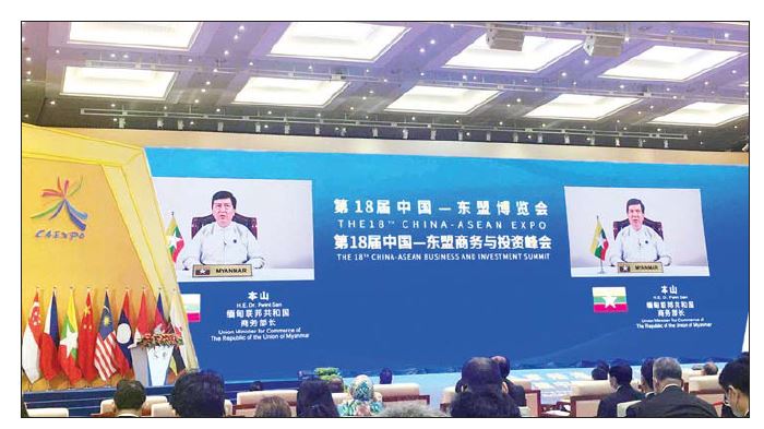 တရုတ်ပြည်သူ့သမ္မတနိုင်ငံ ကွမ်းရှီးကျွမ့်ကိုယ်ပိုင်အုပ်ချုပ်ခွင့်ရဒေသ နန်နင်းမြို့တွင် စက်တင်ဘာ ၁၀ မှ ၁၃ ရက်အထိ ကျင်းပမည့် (၁၈)ကြိမ်မြောက် တရုတ် - အာဆီယံ ကုန်စည်ပြပွဲ ဖွင့်ပွဲအခမ်းအနားကို ယနေ့ နံနက် ၉ နာရီတွင် ကျင်းပရာ စီးပွားရေးနှင့် ကူးသန်းရောင်းဝယ်ရေးဝန်ကြီးဌာန ပြည်ထောင်စုဝန်ကြီး ဒေါက်တာပွင့်ဆန်း Online ဖြင့် တက်ရောက် သည်။