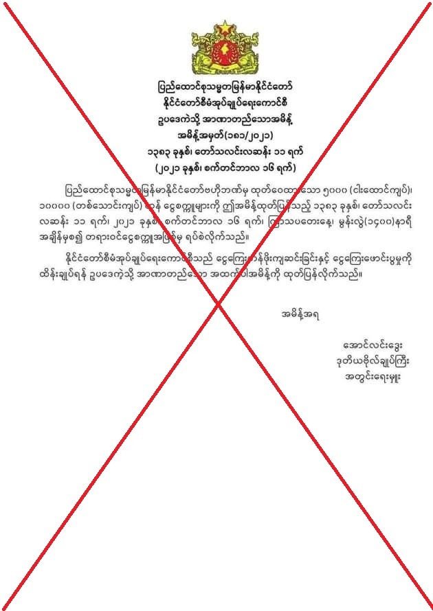 ပြည်ထောင်စုသမ္မတမြန်မာနိုင်ငံတော်ဗဟိုဘဏ်မှ ထုတ်ထားသည့် ၅၀၀၀ ကျပ်တန်၊ ၁၀၀၀၀ ကျပ်တန် ငွေစက္ကူများကို တရားဝင်ငွေစက္ကူအဖြစ်မှ ရပ်စဲလိုက်ကြောင်း အမိန့်စာ အတုများ လူမှုကွန်ရက်စာမျက်နှာပေါ်တွင် ပျံ့နှံ့လျက်ရှိသည်။ အဆိုပါအမိန့်စာအတုမှာ ပြည်သူများစိုးရိမ် ကြောင့်ကြမှုဖြစ်စေရန်နှင့် တည်ငြိမ်မှုပျက်ပြားစေရန် ရည်ရွယ်ပြီး မသမာသူတစ်ချို့က ကောလာဟလ သတင်းထုတ်ပြန်ခြင်းဖြစ်ကြောင်း၊ ယင်းသို့သော ကောလာဟလများကို ပြည်သူများ မယုံကြည်ကြရန်နှင့် ပြည်ထောင်စု သမ္မတမြန်မာနိုင်ငံ တော်ဗဟိုဘဏ်မှ ထုတ်ထားသည့် ငွေစက္ကူများကို စိတ်ချယုံကြည်စွာ သုံးစွဲနိုင်ကြောင်း သတင်းမှန်ပြန်ကြားရေးအဖွဲ့မှ တာဝန်ရှိသူတစ်ဦးထံမှ သိရသည်။