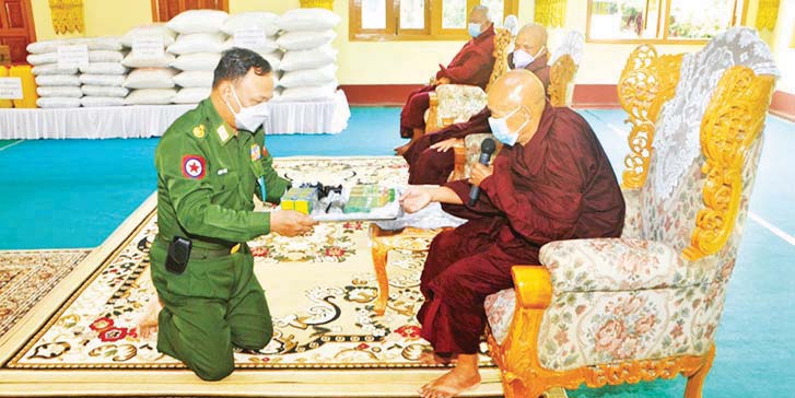 အလားတူ ယနေ့တွင် ရှမ်းပြည်နယ်(အရှေ့ပိုင်း)၊ မိုင်းဆတ်မြို့ရှိ အောင်မင်္ဂလာ ဘုန်းကြီးကျောင်းနှင့် ဇေယျခသုဘုန်းတော်ကြီး ကျောင်း၊ ရန်ကုန်တိုင်းဒေသကြီး၊ လှိုင်သာယာ(အရှေ့ပိုင်း)မြို့နယ်၊ ရှမ်းချောင်းကျေးရွာရှိ ရှမ်းချောင်းဇေတဝန်ကျောင်းတိုက်၊ မှော်ဘီမြို့နယ်၊ ဆပ်သွားတောကျေးရွာရှိ မြိုင်သာယာသာသနာ့ဗိမာန်ကျောင်းတိုက်၊ ဧရာဝတီ တိုင်းဒေသကြီး၊ ဒေးဒရဲမြို့ရှိ မရမ်းကျောင်းတိုက်၊ ပေါ်တော်မူကျောင်းတိုက်၊ သာသနဝိသုဒ္ဓိ စစ်ကွင်းကျောင်းတိုက်နှင့် တော်တန်းကျောင်းတိုက်၊ မန္တလေး တိုင်းဒေသကြီး၊ ချမ်းမြသာစည် မြို့နယ်၊ စလေဘုန်းတော်ကြီးသင်ပညာရေးကျောင်းတို့ရှိ ဆရာတော်၊ သံဃာတော်များနှင့် သာသနာနွယ်ဝင် သီလရှင်များအတွက် ဆွမ်းဆန်တော်၊ ဆီ၊ ဆား၊ ပဲ အမယ်လေးမျိုး၊ ကိုဗစ်-၁၉ရောဂါ ကာကွယ်ရေး အထောက်အကူပြုပစ္စည်းများနှင့် လှူဖွယ်ပစ္စည်းများကို သက်ဆိုင်ရာ တိုင်းစစ်ဌာနချုပ်များမှ တိုင်းမှူးများနှင့် တာဝန်ရှိသူများက သွားရောက်ဆက်ကပ်လှူဒါန်း ခဲ့ကြကြောင်း သတင်းရရှိသည်။