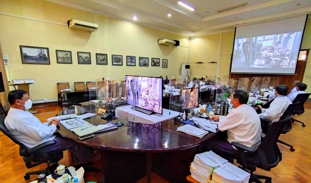 လျှပ်စစ်နှင့်စွမ်းအင်ဝန်ကြီးဌာနသည် နိုင်ငံတော်၏ စိုက်ပျိုးရေးကဏ္ဍအတွက် လိုအပ်သော ဓာတ်မြေဩဇာလိုအပ်ချက်ကို ဖြည့်ဆည်းပေးနိုင်ရေး အမှတ်(၃) ဓာတ်မြေ ဩဇာစက်ရုံ(ကျော်စွာ) ပြန်လည်လည်ပတ်၍ ဓာတ်မြေဩဇာထုတ်လုပ်ဖြန့်ဖြူးနိုင်ရန် စီစဉ် ဆောင်ရွက်လျက်ရှိရာစက်ရုံ လည်ပတ်နိုင်ရန်လိုအပ်သော သဘာဝဓာတ်ငွေ့ပိုက်လိုင်း ဆက်သွယ်ပြုပြင်ခြင်းနှင့် စက်ရုံ ပြင်ဆင်ခြင်းလုပ်ငန်းများဆောင်ရွက်နေမှုကို ပြည်ထောင်စုဝန်ကြီး ဦးအောင်သန်းဦးနှင့် တာဝန်ရှိ သူများက ညှိနှိုင်းဆွေးနွေး ခဲ့ကြပြီး လုပ်ငန်းခွင် ဆောင်ရွက်နေမှုတို့ကို Virtual စနစ်ဖြင့် ကြည့်ရှု စစ်ဆေးသည်။