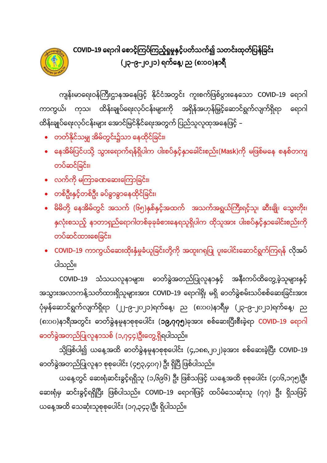 COVID-19 ရောဂါ စောင့်ကြပ်ကြည့်ရှုမှုနှင့်ပတ်သက်၍ သတင်းထုတ်ပြန်ခြင်း (၂၃-၉-၂၀၂၁) ရက်နေ့၊ ည (၈:၀၀)နာရီ 09/23/2021