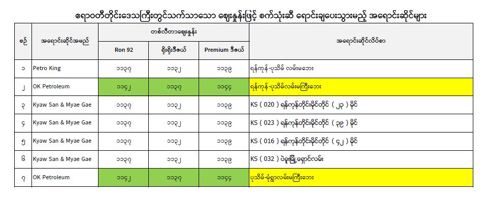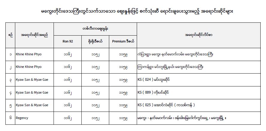 ထပ်မံ၍ ကျန်တိုင်းဒေသကြီး/ပြည်နယ်များတွင် သတ်မှတ်ဈေးနှုန်းဖြင့် ရောင်းချပေးနေသည့် စက်သုံးဆီဈေးနှုန်းနှင့် အရောင်းဆိုင်လိပ်စာတို့ကို ပြည်သူများ သိရှိဝယ်ယူနိုင်ရန် ထပ်မံဖော်ပြထားသည်။