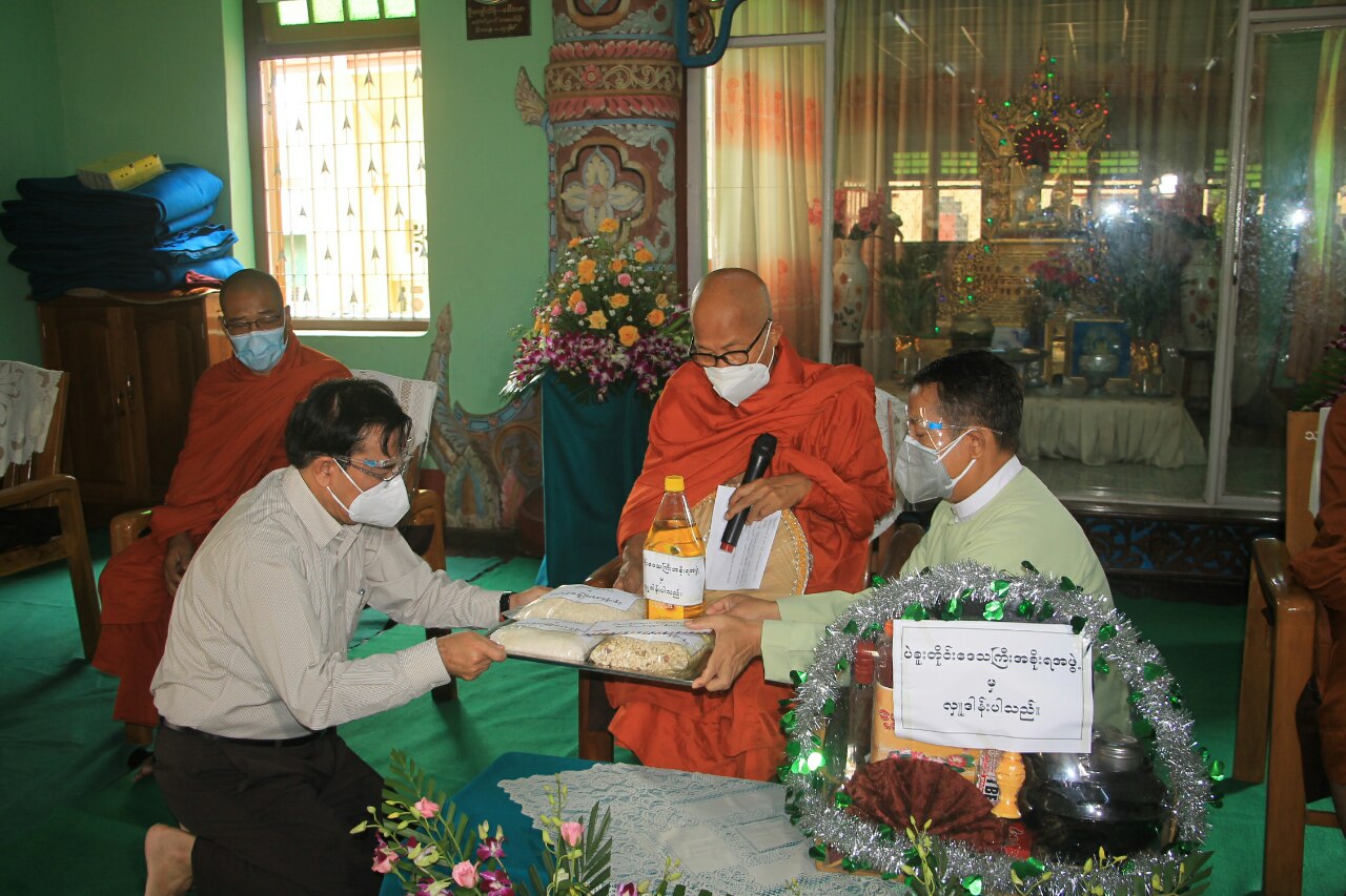 ပဲခူးတိုင်းဒေသကြီးအစိုးရအဖွဲ့ တိုင်းဒေသကြီးဝန်ကြီးချုပ် ဦးမျိုးဆွေဝင်းသည် တောင်ပိုင်းတိုင်း စစ်ဌာနချုပ်တိုင်းမှူး ဗိုလ်မှူးချုပ်ထိန်ဝင်း၊ တိုင်းဒေသကြီးဝန်ကြီးများ၊ တာဝန်ရှိသူများနှင့်အတူ ယမန်နေ့ နံနက်ပိုင်းက တောင်ငူမြို့ ကြာနီကန်ပရိယတ္တိစာသင်တိုက်သို့ သွားရောက်၍ တောင်ငူမြို့ရှိ ပရိယတ္တိစာသင်တိုက် (၄) တိုက် နှင့် သီလရှင်စာသင် တိုက်(၁)တိုက်တို့အတွက် ဆွမ်းဆန်(၆၃)အိတ်၊ ဆီ(၁၅၇) ပိဿာ၊ ပဲ(၁၅၇)ပိဿာ၊ ဆား(၁၅၇)ပိဿာ၊ ကျန်းမာရေးသုံး အထောက်အကူပြုပစ္စည်းများနှင့် နဝကမ္မအလှူငွေကျပ်(၅)သိန်းတို့ကို ဆက်ကပ်လှူဒါန်းပြီး ဆရာတော်၊ သံဃာတော် များအား နေ့ဆွမ်းဆက်ကပ်လှူဒါန်းကြသည်။