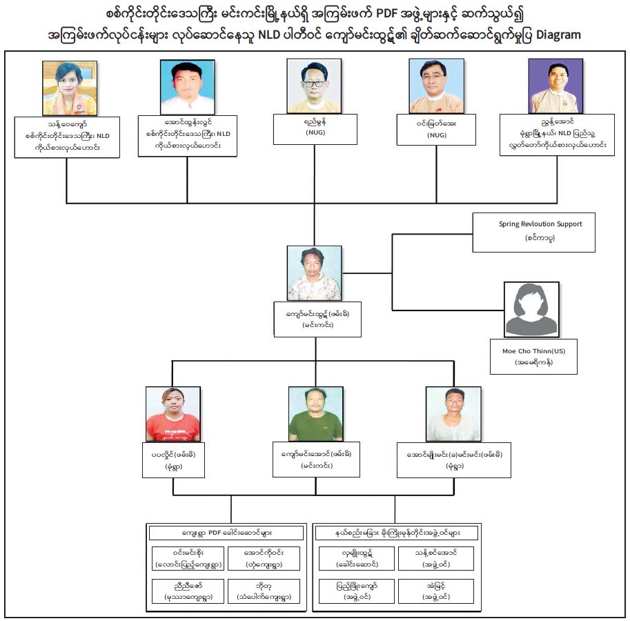 ထို့အပြင် တရားခံပြေးညွန့်အောင် (NLD ပါတီဝင်၊ မုံရွာမြို့နယ်ပြည်သူ့ လွှတ်တော် ကိုယ်စားလှယ်ဟောင်း)၊ တရားမဝင်ဖွဲ့စည်းထားသော အကြမ်းဖက်အဖွဲ့အစည်း ဖြစ်သည့် NUG အဖွဲ့ဝင် ဝင်းမြတ်အေး၊ အမေရိကန်နိုင်ငံနေ Moe Cho Thinn၊ စင်ကာပူရောက်မြန်မာများ စုပေါင်းဖွဲ့စည်းထားသည့် Spring Revolution Support တို့နှင့် ဆက်သွယ်၍ တရားမဝင်ငွေကြေး ကောက်ခံမှုများ လုပ်ဆောင်ခဲ့ပြီး မင်းကင်းမြို့နယ်အတွင်း အကြမ်းဖက်လုပ်ငန်းများနှင့် အပြစ်မဲ့ပြည်သူများအား ဒလန်အဖြစ် စွပ်စွဲ သတ်ဖြတ်ခြင်းများ လုပ်ဆောင်နေသည့် မုဿာကျေးရွာ၊ တုံကျေးရွာနှင့် သံပေါက် ကျေးရွာများရှိ PDF အဖွဲ့များနှင့် နယ်စည်းမခြားမိုးကြိုးမုန်တိုင်းအဖွဲ့ထံသို့ ဖြန့်ခွဲ ပေးပို့ခဲ့ကြောင်း သိရှိရသည်။