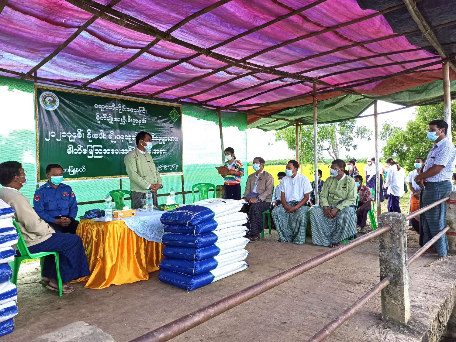 ဓာတ်မြေဩဇာပေးအပ်ပွဲတွင် မြို့နယ်စီမံအုပ်ချုပ်ရေးအဖွဲ့ဥက္ကဋ္ဌ ဦးကျော်သူက အမှာပြောကြားပြီး စိုက်ပျိုးရေးဦးစီးဌာနမှ မြို့နယ်ဦးစီးမှူး ဦးစိန်သန်းက မိုးစပါးမျိုးစေ့ထုတ် တောင်သူများအတွက် ဓာတ်မြေဩဇာ ထောက်ပံ့ပေးအပ်ရသည့် အကြောင်းအရင်းများကို ရှင်းလင်းပြောကြားခဲ့သည်။