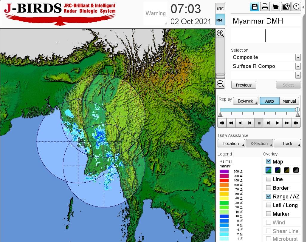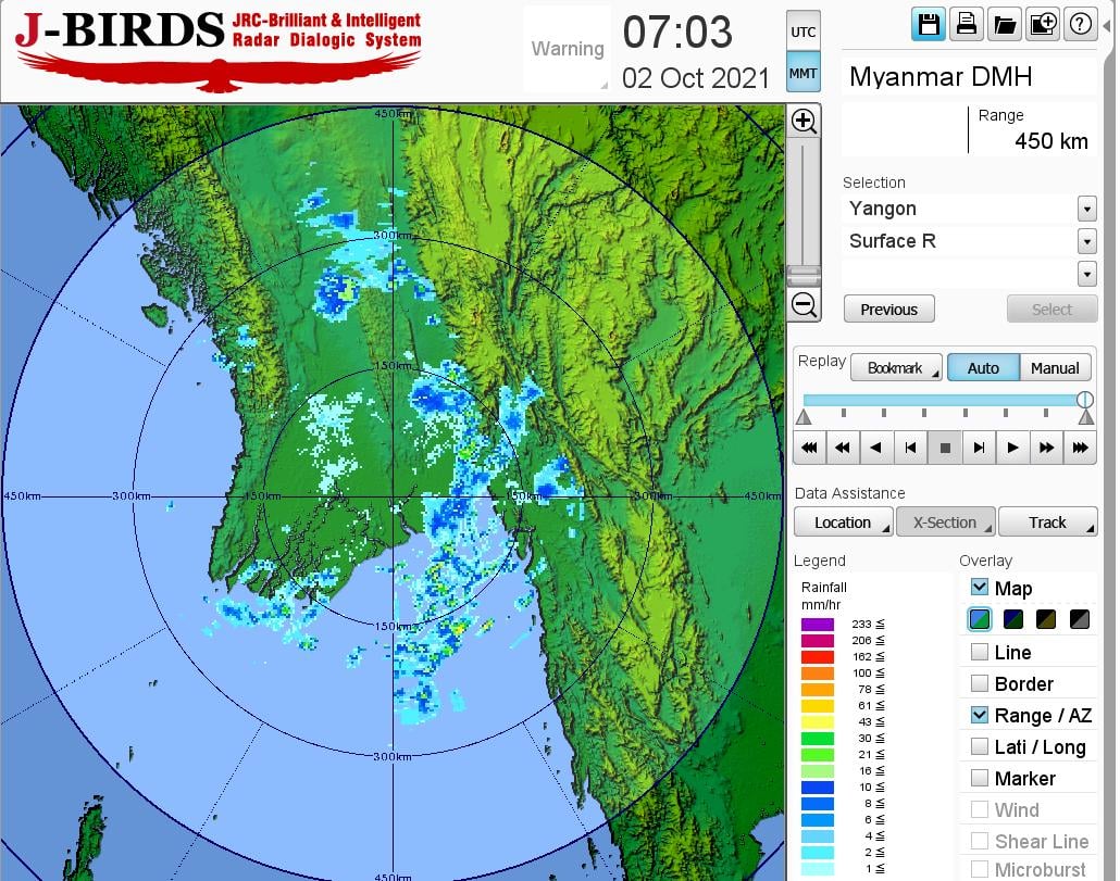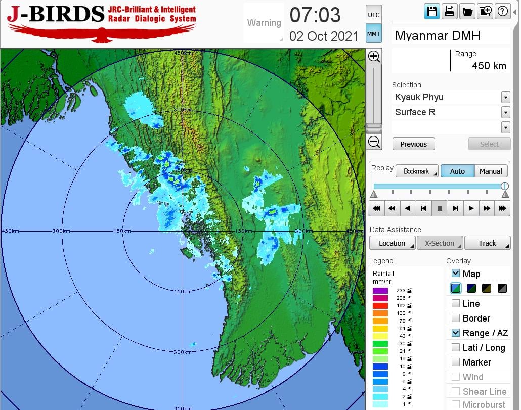 ယနေ့ညနေအထိခန့်မှန်းချက်။ နေပြည်တော်တွင် နေရာအနှံ့အပြား၊ ပဲခူးတိုင်းဒေသကြီး၊ ရှမ်းပြည်နယ်(တောင်ပိုင်း)နှင့် ချင်းပြည်နယ်တို့တွင် နေရာစိပ်စိပ်၊ စစ်ကိုင်းတိုင်းဒေသကြီး အောက်ပိုင်း၊ မန္တလေးတိုင်းဒေသကြီး၊ မကွေးတိုင်းဒေသကြီး၊ ရန်ကုန်တိုင်းဒေသကြီး၊ တနင်္သာရီတိုင်းဒေသကြီး၊ကချင်ပြည်နယ်၊ ကယားပြည်နယ်၊ ကရင်ပြည်နယ် နှင့် မွန်ပြည်နယ် တို့တွင် နေရာကျဲကျဲနှင့် ကျန်တိုင်းဒေသကြီးနှင့် ပြည်နယ်တို့တွင် နေရာကွက်ကျား မိုးထစ်ချုန်းရွာပြီး၊ နေပြည်တော်တွင် ဒေသအလိုက်နှင့် မန္တလေးတိုင်းဒေသကြီးတွင် နေရာကွက်၍ မိုးကြီးနိုင်ပါသည်။ ရွာရန်ရာနှုန်းပြည့် ဖြစ်ပါသည်။