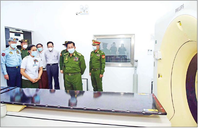 ထို့နောက် နိုင်ငံတော်စီမံအုပ်ချုပ်ရေးကောင်စီဥက္ကဋ္ဌ တပ်မတော်ကာကွယ်ရေးဦးစီးချုပ်နှင့် အခမ်းအနား တက်ရောက်လာကြသူများက ဓာတ်ရောင်ခြည်ကုသဆောင်နှင့် ကင်ဆာရောဂါ ခွဲစိတ်ကုသဆောင် အတွင်း စက်ပစ္စည်းများ တပ်ဆင်ထားမှု အခြေအနေများအား လိုက်လံကြည့်ရှုရာ တာဝန်ရှိသူများက ရှင်းလင်း တင်ပြကြသည်။