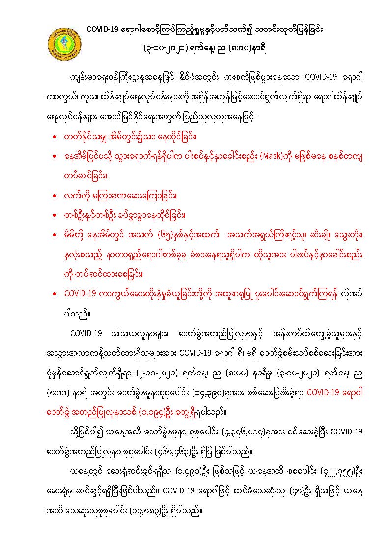 COVID-19 ရောဂါ စောင့်ကြပ်ကြည့်ရှုမှုနှင့်ပတ်သက်၍ သတင်းထုတ်ပြန်ခြင်း (၃-၁၀-၂၀၂၁) ရက်နေ့၊ ည (၈:၀၀)နာရီ 10/03/2021