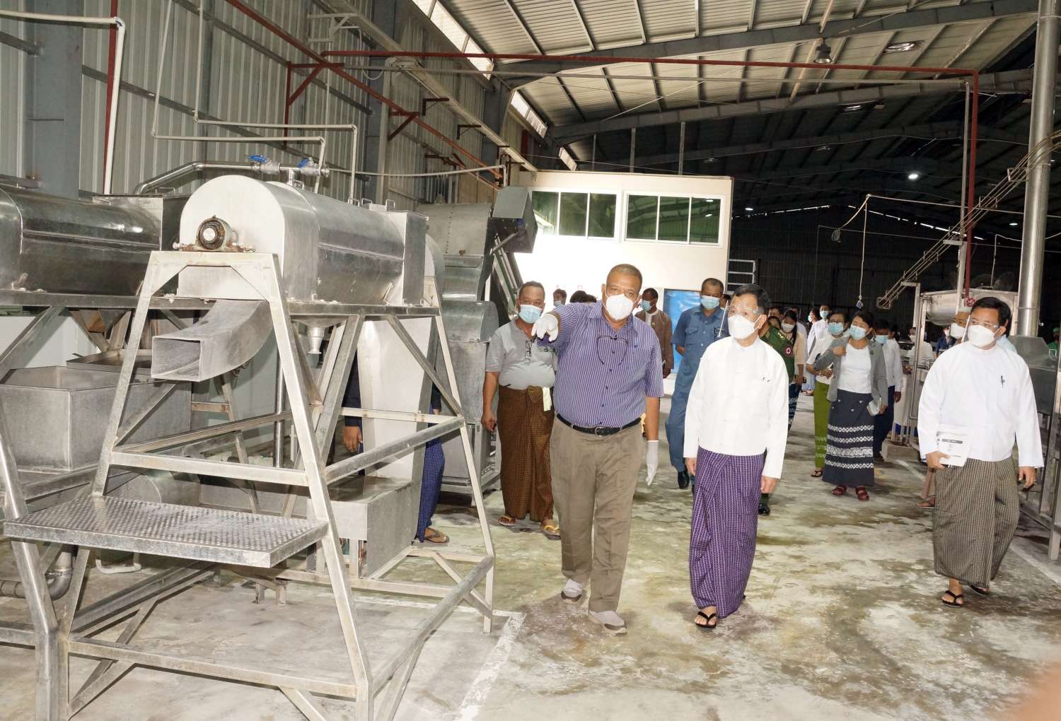 ဆက်လက်၍ နေပြည်တော်ကောင်စီဥက္ကဋ္ဌနှင့် အဖွဲ့ဝင်များသည် မြန်မာရွှေသစ်သီးဝလံနှင့် ဟင်းသီးဟင်းရွက် တန်ဖိုးမြှင့်ထုတ် ကုန်ထုတ်လုပ်ရောင်းချ ခြင်းလုပ်ငန်းသို့ ရောက်ရှိရာ စက်ရုံမှ စက်ရုံပိုင်ရှင် ဦးတင်ချိုက သရက် (အခြောက်၊ ပျဉ်၊ အနှစ်)၊ ငှက်ပျောကြော်၊ နာနတ် (အခြောက်၊စည်သွတ်)၊ ပဲစည်သွတ်ဘူးများ၊ အခြားသစ်သီးများနှင့် မျှစ်ခြောက်၊ မျှစ်စည်သွတ်ဘူးများ ထုတ်လုပ်ရောင်းချနေမှုကို ရှင်းလင်းတင်ပြရာ နေပြည်တော်ကောင်စီဥက္ကဋ္ဌက ဒေသခံပြည်သူများ အလုပ်အကိုင်အခွင့်အလမ်း များရရှိရေးနှင့် အရည်အသွေးပြည့်မှီ သည့်စားသောက်ကုန်များထုတ်လုပ်ပြီး နိုင်ငံခြားဝင်ငွေများရရှိအောင် ဆောင်ရွက်စေလို ကြောင်းမှာကြားပြီး နှာခေါင်းစည်း (Mask) များပေးအပ်ကာ စက်ရုံလည်ပတ်နေမှုကို လှည့်လည်ကြည့်ရှုခဲ့ကြောင်း သိရသည်။