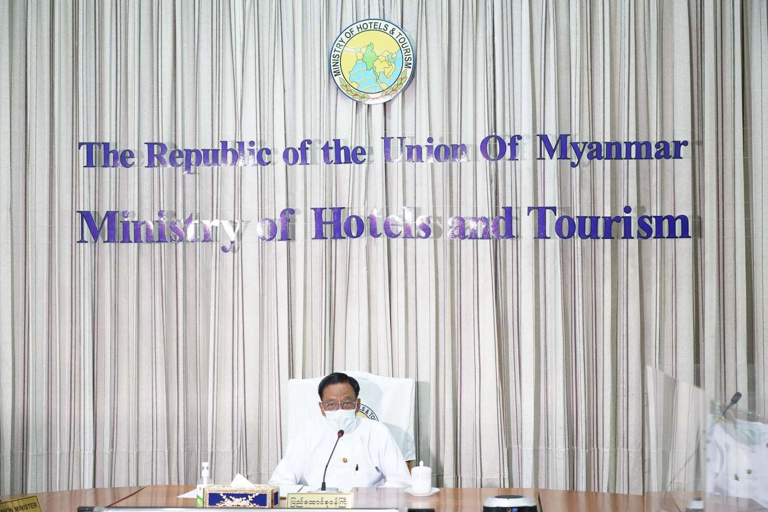 ထို့နောက် Online မှ တက်ရောက်လာကြသည့် နေပြည်တော်ကောင်စီအပါအဝင် တိုင်း ဒေသကြီး/ ပြည်နယ် ရုံးခွဲတာဝန်ခံများနှင့် ဟိုတယ်ဇုန် ဥက္ကဋ္ဌများက ဟိုတယ်များ ဖွင့်လှစ် ထားရှိမှုနှင့် ခရီးစဉ်ဒေသအခြေအနေ၊ ဟိုတယ်နှင့်ခရီးသွားလုပ်ငန်းဆိုင်ရာ နယ်ပယ် (၇) မျိုးတွင် လုပ်ကိုင် ဆောင်ရွက်နေသူများအား ကိုဗစ်-၁၉ ကာကွယ်ဆေး ထိုးနှံပြီးစီးမှု အခြေအနေ၊ Online မှ Outsoursing သင်တန်းများဖွင့်လှစ်ထားရှိမှု၊ ခရီးစဉ်ဒေသ အသစ်များ ဖော်ဆောင် နေမှုများကို ဆွေးနွေးတင်ပြကြရာ ပြည်ထောင်စုဝန်ကြီးက ဝန်ထမ်းများ ကိုဗစ်-၁၉ ကာကွယ် ဆေးအပြည့် အဝထိုးနှံနိုင်ရေး၊ Online သင်တန်းများကို ဟိုတယ်နှင့်ခရီးသွားလုပ်ငန်းမှ ဝန်ထမ်းများ ထိထိ ရောက်ရောက် ပါဝင်တက်ရောက်ပြီး လက်တွေ့ဝန် ဆောင်မှုပေးနိုင်အောင် ဆောင်ရွက် ကြရေး၊ ခရီးစဉ်ဒေသအသစ်များနှင့် ခရီးသွားဆွဲဆောင်မှုအသစ်များ စနစ်တကျ ဖော်ထုတ်ရေးတို့ကို မှာ ကြားပြီး လိုအပ်သည်များကို ပေါင်းစပ်ညှိနှိုင်း ဆောင်ရွက်ပေးခဲ့ကြောင်း သိရသည်။