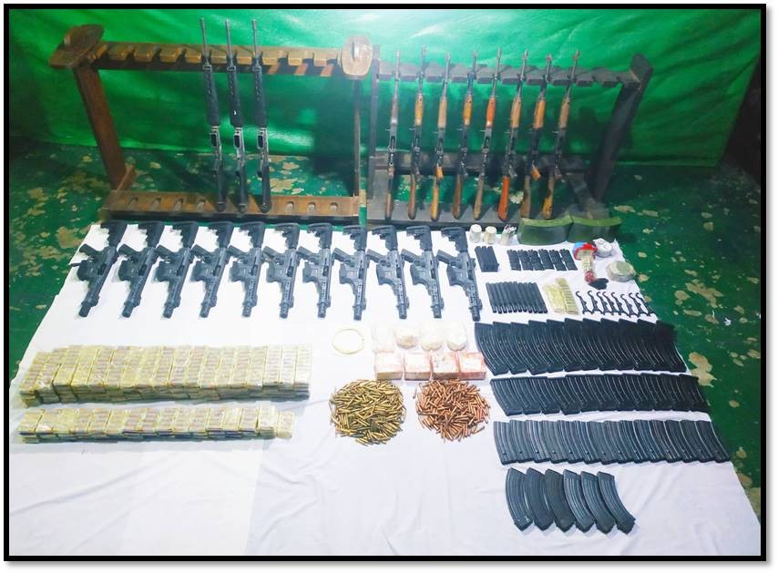 ကြံခင်းမြို့နယ်၊ ကလို့ကွင်းကျေးရွာတွင် PDF သင်တန်းဆင်း အကြမ်းဖက်သမားတစ်ဦး ရောက်ရှိနေ ကြောင်း သတင်းအရ လုံခြုံရေးတပ်ဖွဲ့ဝင်များ သွားရောက်ဖမ်းဆီး၍ လိုအပ်သည့် စစ်ဆေးမှုများ ပြုလုပ်ခဲ့ရာ ၎င်း၏ ထွက်ဆိုချက်အရ သစ်ဆိမ့်ကုန်း ကျေးရွာအနီးရှိ တောင်ယာတဲတစ်ဝိုက် တွင်းတူးမြုပ် ထားသည့် MK-12 ၁၁ လက်၊ M-22 ၈ လက်၊ M-16 ၃ လက်၊ ၅.၅၆ ကျည် ၃၅၀ တောင့်၊ ၇.၆၂ ကျည် ၁၃ဝ တောင့်၊ AK-47 ကျည် ၆ဝဝ တောင့်၊ ပြောင်းချော ကျည် ၁၁၂ဝ တောင့်၊ နင်းမိုင်းအသေး ၃ လုံး၊ နင်းမိုင်းအကြီး (ယမ်းမပါ) ၁ လုံး၊ ရှေ့ထွက်မိုင်း ၂ လုံး၊ ကျည်အိမ်မျိုးစုံ ၄၂ ခု၊ MK-12 ပြောင်း(အပို) ၁၁ ချောင်း၊ MK-12 လက်ကိုင် ၃ ခု၊ ယမ်းထုတ် ၄ ထုတ်နှင့် ဆက်စပ်ပစ္စည်းမျိုးစုံ ၁၇ ခု တို့အား အောက်တိုဘာလ (၉) ရက် ညနေပိုင်းတွင် သိမ်းဆည်းရမိခဲ့သည်။