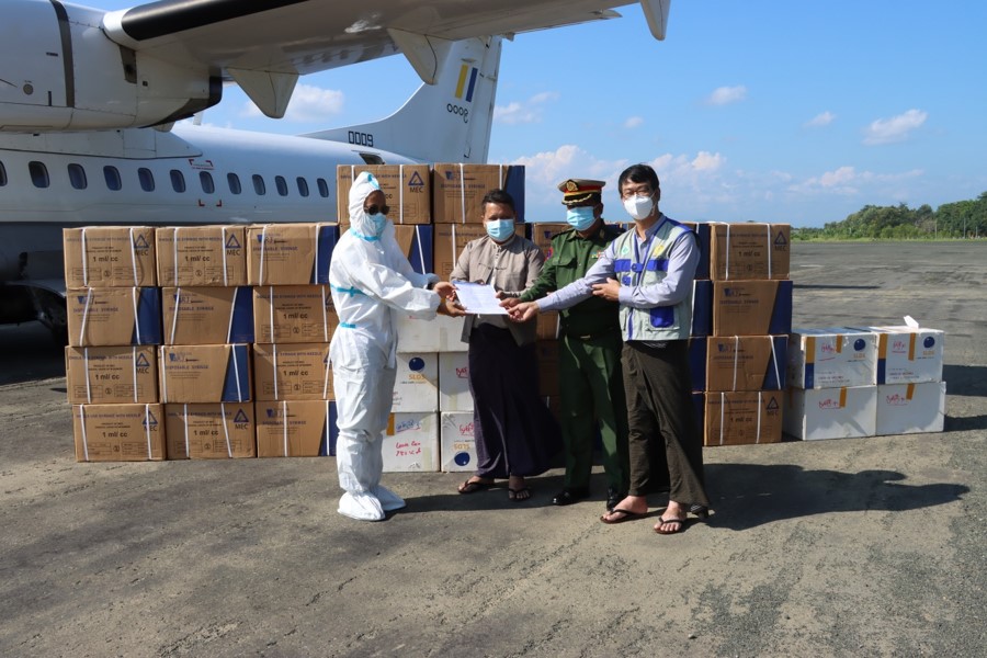 ကိုဗစ်-၁၉ရောဂါ ဓာတ်ခွဲအတည်ပြုပိုးတွေ့လူနာများနှင့် သီးသန့်စောင့် ကြည့်ရမည့်သူများအား  တပ်မတော်ဆေးရုံများ၊ ပြည်သူ့ဆေးရုံများ၊ ကျန်းမာရေး ဌာနများနှင့် ကိုဗစ်စင်တာများတွင် ကျန်းမာရေးစောင့်ရှောက်မှု လုပ်ငန်းများကို တပ်မတော်သားဆရာ၀န်များ၊ ကျန်းမာရေး ၀န်ထမ်းများ၊ လူမှုရေး အသင်းအဖွဲ့များ ပူးပေါင်း၍ အင်တိုက်အား တိုက်ဆောင်ရွက်ပေးလျက် ရှိရာ ၎င်းလုပ်ငန်းများတွင် အထောက်အကူဖြစ် စေရန်အတွက် ကိုဗစ်-၁၉ ရောဂါ ကာကွယ် ဆေးများကို သတ်မှတ်အအေးလမ်းကြောင်း စံချိန်စံညွှန်းများအတိုင်း တပ်မတော်(လေ)မှ လေယာဉ်များ၊ မော်တော်ယာဉ်များဖြင့် ပို့ဆောင်ပေးလျက်ရှိသည်။