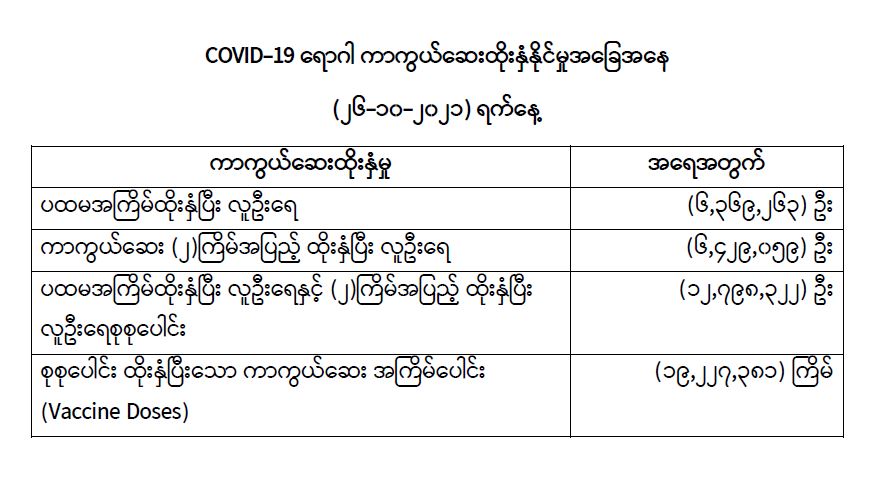 COVID-19 ရောဂါ ကာကွယ်ထိန်းချုပ်ရေးအတွက် တိုင်းဒေသကြီး/ပြည်နယ်များတွင် COVID-19 ရောဂါကာကွယ်ဆေးကို ဦးတည်အုပ်စုများသတ်မှတ်၍ ထိုးနှံပေးလျက်ရှိရာ (၂၆-၁၀-၂၀၂၁) ရက်နေ့အထိ လူဦးရေ စုစုပေါင်း (၁၂,၇၉၈,၃၂၂) ဦးအား ထိုးနှံပေးပြီးဖြစ်၍ ကာကွယ်ဆေးနှစ်ကြိမ် အပြည့်ထိုးနှံပြီးစီးသူ (၆,၄၂၉,၀၅၉) ဦး နှင့် ပထမအကြိမ်ထိုးနှံပြီးစီးသူ (၆,၃၆၉,၂၆၃) ဦး ရှိပြီဖြစ် ပါသည်။ သို့ဖြစ်ပါ၍ (၂၆-၁၀-၂၀၂၁) ရက်နေ့အထိ မြန်မာနိုင်ငံတွင် COVID-19 ရောဂါကာကွယ် ဆေးအကြိမ်ရေ စုစုပေါင်း (၁၉,၂၂၇,၃၈၁) ကြိမ် ထိုးနှံပြီး ဖြစ်ပါသည်။