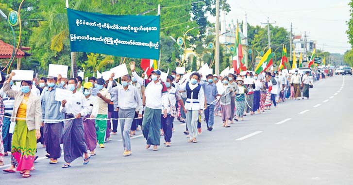 ထိုသို့ ဆန္ဒဖော်ထုတ်ရာတွင် “နိုင်ငံတော်စီမံ အုပ်ချုပ်ရေးကောင်စီအား ထောက်ခံပါသည်။ အမျိုးဘာသာ သာသနာကို စောင့်ရှောက်သော မြန်မာ့တပ်မတော်အား ထောက်ခံပါသည်၊ NUG၊ CRPHi PDF အကြမ်းဖက်သမားအလိုမရှိ၊ NUG၊ CRPH PDF အကြမ်းဖက်လုပ်ရပ်များအား ဆန့်ကျင် ကြ၊ ပြည်ထောင်စုမပြိုကွဲရေးဒို့အရေး၊ တိုင်းရင်းသား စည်းလုံးညီညွတ်မှု မပြိုကွဲရေး ဒို့အရေး၊ အချုပ်အခြာ အာဏာတည်တံ့ခိုင်မြဲရေး ဒို့အရေး၊ ပြည်ပအားကိုး ပုဆိန်ရိုးများအား ဆန့်ကျင်ကြ၊ မြန်မာ့ပြည်တွင်းရေး ပြည်ပစွက်ဖက်မှု အလိုမရှိ၊ နိုင်ငံတော်စီမံအုပ်ချုပ်ရေးကောင်စီ လုပ်ငန်းစဉ် (၅)ရပ်အား ထောက်ခံပါသည်။ ဒီမို ကရေစီအရေခြုံ ကွန်မြူနစ်လုပ်ရပ်ကျဆုံးပါစေ၊ NUGI PDF same:unda sa Gogosi NUGI PDF အကြမ်းဖက်မှုတွေ မြင်အောင်ကြည့်၊ NUG PDF ရဲ့ ပြည်သူ့အပေါ် အကြမ်းဖက်မှု ချက်ချင်း ရပ်” စသည့်စာသားပါ ဆိုင်းဘုတ်များအား ကိုင်ဆောင် ကြွေးကြော်ခဲ့ကြကြောင်း သတင်းရရှိသည်။
