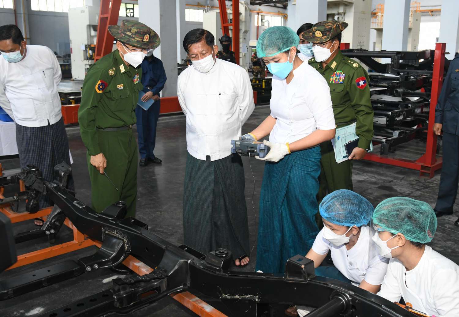 ထို့နောက် နိုင်ငံတော်စီမံအုပ်ချုပ်ရေးကောင်စီဥက္ကဋ္ဌ နိုင်ငံတော်ဝန်ကြီးချုပ်နှင့် အဖွဲ့ဝင်များသည် စက်ရုံအတွင်း မော်တော်ယာဉ်နှင့် ဆက်စပ်ပစ္စည်းများအား ခေတ်မီစက်ကိရိယာများနှင့် နည်းပညာများ အသုံးပြု၍ ထုတ်လုပ်လျက်ရှိသည့် အခြေအနေများကို လှည့်လည်ကြည့်ရှုကြရာ တာဝန်ရှိသူများက လိုက်လံရှင်းလင်း တင်ပြကြပြီး နိုင်ငံတော် စီမံအုပ်ချုပ်ရေးကောင်စီဥက္ကဋ္ဌ နိုင်ငံတော်ဝန်ကြီးချုပ်က စက်ရုံဝန်ထမ်းများအတွက် ချီးမြှင့်ငွေများ ပေးအပ်သည်။
