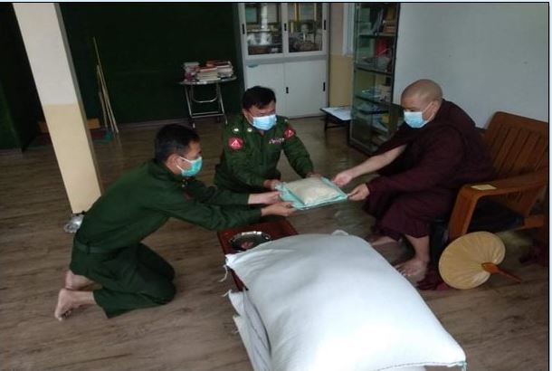 ကိုဗစ်-၁၉ ရောဂါ ကြိုတင်ကာကွယ်ရေးလုပ်ငန်းများ ဆောင်ရွက်နေသည့်ကာလအတွင်း ဆွမ်းကိစ္စရပ်များ အဆင်ပြေစေရန်ရည်ရွယ်၍ တပ်မတော် (ကြည်း၊ ရေ၊ လေ) အရာရှိ၊ စစ်သည်၊ အရာထမ်း၊ အမှုထမ်းများနှင့် စေတနာရှင်အလှူရှင်များက မြို့နယ် အသီးသီးရှိ ဘုန်းတော်ကြီး ကျောင်းများ၊ သာသနာနွယ်ဝင် သီလရှင်ကျောင်းများနှင့် ဘာသာရေးကျောင်းများသို့ ဆွမ်းဆန်တော်၊ ဆီ၊ ဆား၊ ပဲ အမယ်(၄)မျိုးနှင့် လှူဖွယ်ပစ္စည်းများ လှူဒါန်းခြင်း၊ နေ့ဆွမ်းများ ဆက်ကပ်လှူဒါန်းခြင်းနှင့် ကျန်းမာရေး စစ်ဆေးပေးခြင်းများကို ဆောင်ရွက်လျက်ရှိသည်။