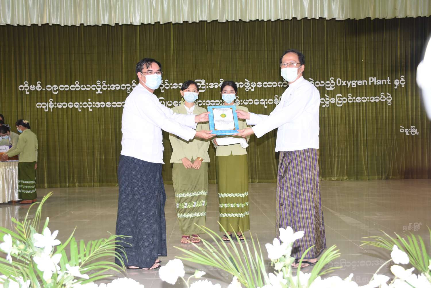 ထို့နောက် တိုင်းဒေသကြီး ဝန်ကြီးချုပ်က ကိုဗစ်-၁၉ တတိယလှိုင်းအတွင်း ထောက်ပံ့ပေးခဲ့သည့် Oxygen Plant များနှင့် ကျန်းမာရေးသုံး အထောက်အကူပြုပစ္စည်းများ၏ စာရင်းဇယားများအား ပြည်ထောင်စုဝန်ကြီးထံသို့လည်းကောင်း၊ တိုင်းဒေသကြီး အစိုးရအဖွဲ့ဝင် ဝန်ကြီးများက Oxygen Plant များနှင့် ကျန်းမာရေးသုံး အထောက်အကူပြုပစ္စည်းများ၏ မှတ်တမ်း ဓာတ်ပုံများကို ဆေးရုံအုပ်ကြီးများနှင့် မြို့နယ်ကုသရေးဦးစီးဌာနမှူးများအား လွှဲပြောင်းပေးအပ်ခဲ့သည်။ ထို့ပြင် တာဝန်ကျေပွန်စွာ ဆောင်ရွက်ခဲ့သည့် ကျန်းမာရေးဝန်ထမ်းများအတွက် ဂုဏ်ပြုချီးမြှင့်ငွေ တစ်မြို့နယ်လျှင် ကျပ်(၅)သိန်းနှင့် ဂုဏ်ပြုမှတ်တမ်းလွှာ များကိုပေးအပ်ခဲ့ပြီး ပဲခူးတိုင်းဒေသကြီး ပြည်သူ့ကျန်းမာရေးဦးစီးဌာနနှင့် ကုသရေးဦးစီးဌာနမှူး ဒေါက်တာသီဟက ကျေးဇူးတင် စကားပြောကြားသည်။