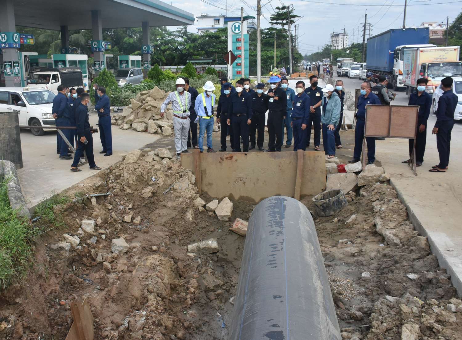 ဆက်လက်၍ မြို့တော်ဝန်နှင့်အဖွဲ့သည် ဒဂုံမြို့သစ်(မြောက်ပိုင်း)မြို့နယ်၊ ပြည်ထောင်စုလမ်း တစ်လျှောက်  710 HDPE ရေပိုက်လိုင်းသွယ်တန်းနေမှု လုပ်ငန်းခွင်ကို ကြည့်ရှုစစ်ဆေးပြီး လုပ်ငန်းခွင် အန္တရာယ်ကင်းရှင်းရေးနှင့် သတ်မှတ်ကာလအတွင်း စံချိနိစံညွှန်းမီ ပြီးစီးအောင် ဆောင်ရွက်ရေးတို့ကို မှာကြားပြီး လိုအပ်သည်များကို ဖြည့်ဆည်းဆောင်ရွက်ပေးခဲ့ကြောင်း သိရသည်။
